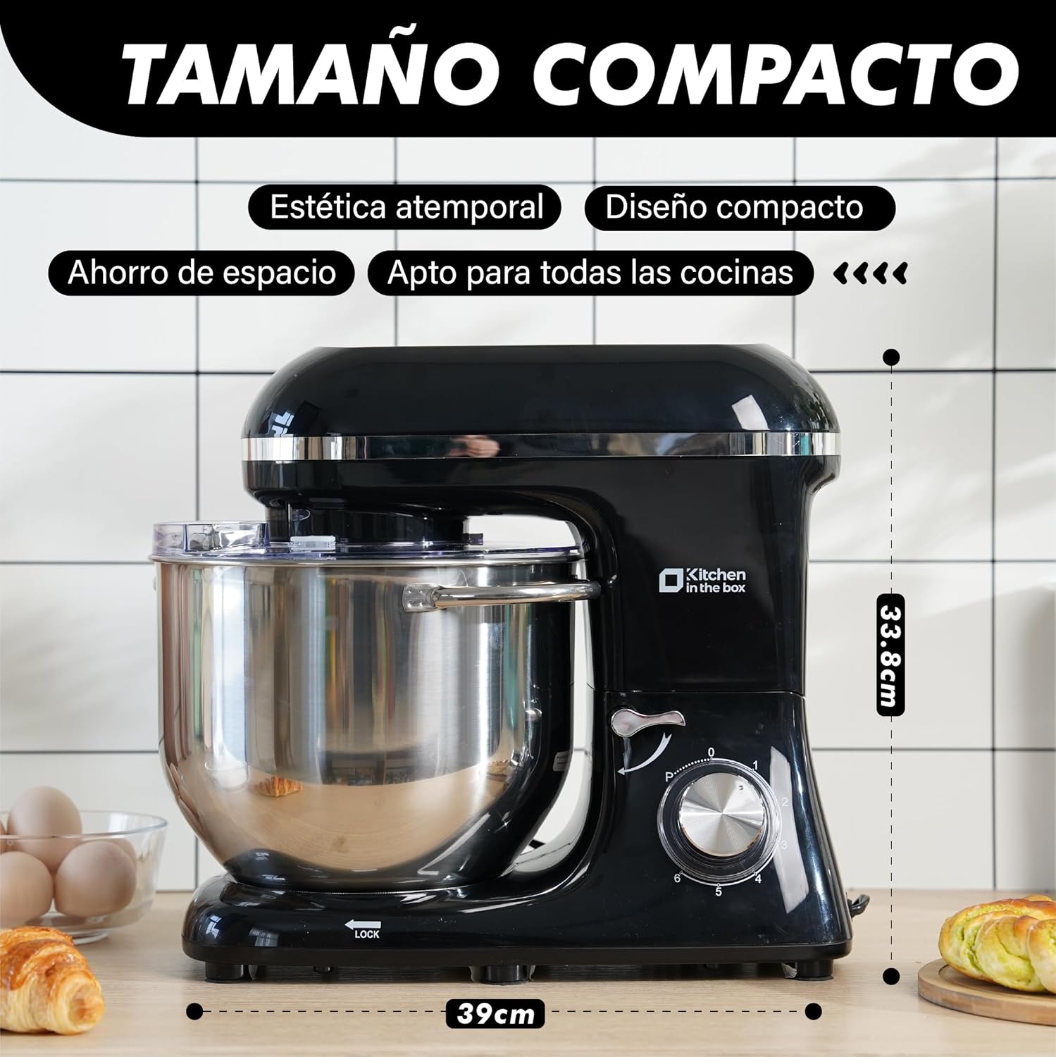 3 Accesorios: El robotic de cocina incluye tres accesorios: un gancho amasador para amasar densas, una batidora mezcladora para mezclar ensaladas y un batidor de varillas para batir claras de huevo y nata. Estos accesorios se pueden lavar en el lavavajillas.