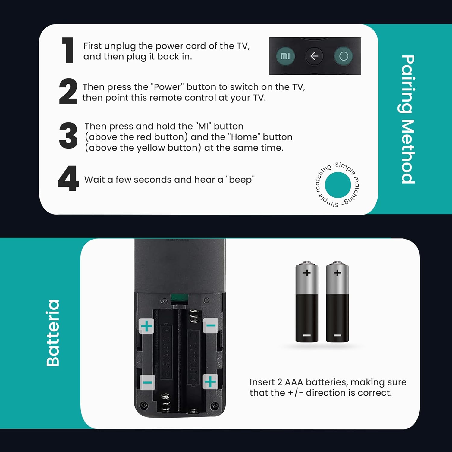(Instrucciones de emparejamiento) Primero, Handbook de Enciende el televisor Xiaomi o la Caja Xiaomi. Coloque El Management Remoto Junto al Televisor O Caja Xiaomi y Mantenga presiónado El Botón Rojo de Inicio en la Parte Inferior Durante 15-30 Segunundos. Dispués de Mostrar La Interfaz de Emparejamiento de TV, suelte el Botón y Espere un televisor Maestre La Pantalla. Y El Acoplamiento Está Completo, Ahora Está Listo para USAR. Si El El Emparejamiento Falla, Repita Los Pasos Anteriores.