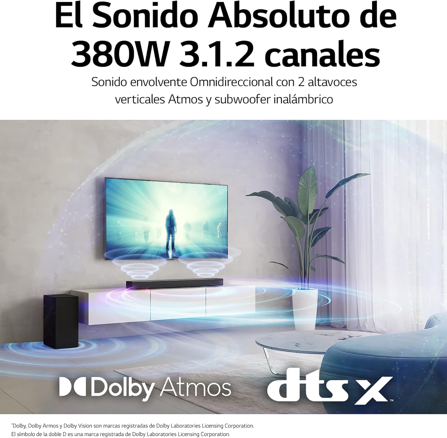 LG S75Q – Barra de Sonido Inteligente, 380W Potencia y 3.1.2 Canales, Doble Altavoz Atmos vertical. Sonido Envolvento Absoluto Dolby Atmos y DST: X, Hello-Res 24bits/96khz y Meridian Horizon