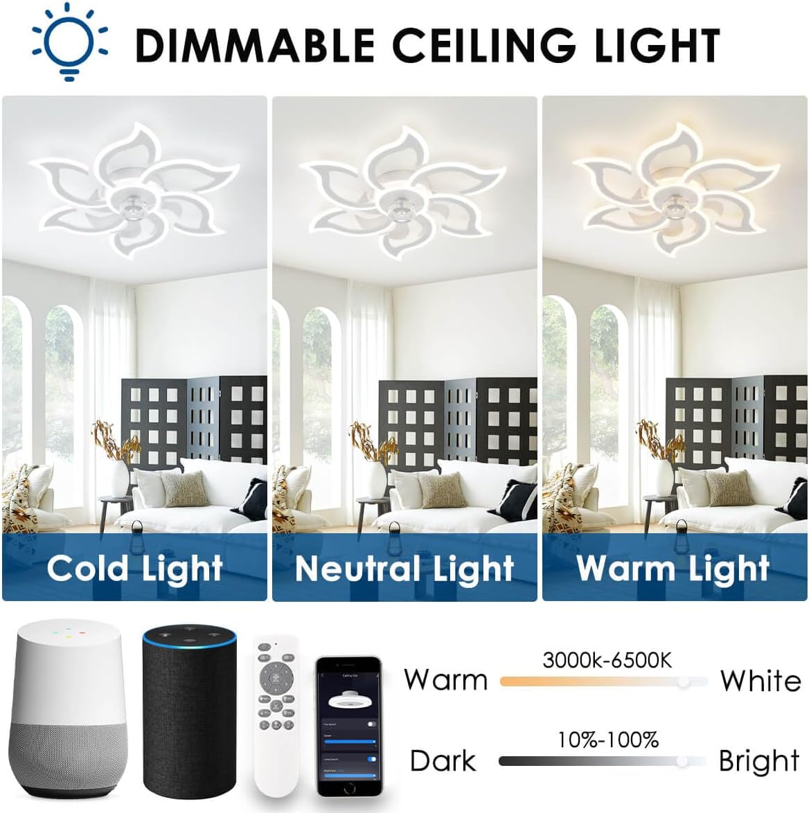 💡 【Luz con función de memoria】 El diseño de luz del lampara ventilador es verdaderamente innovador. Puedes ajustar el brillo (10%-100%) y la temperatura de coloration (3000k-6000k) tanto con el management remoto como con el interruptor de pared. Crea efectos de iluminación personalizados y establece diferentes atmósferas. Además, la función de memoria permite volver a encender la luz del ventilador de techo para restaurar los ajustes de luz de la última vez que se apagó.