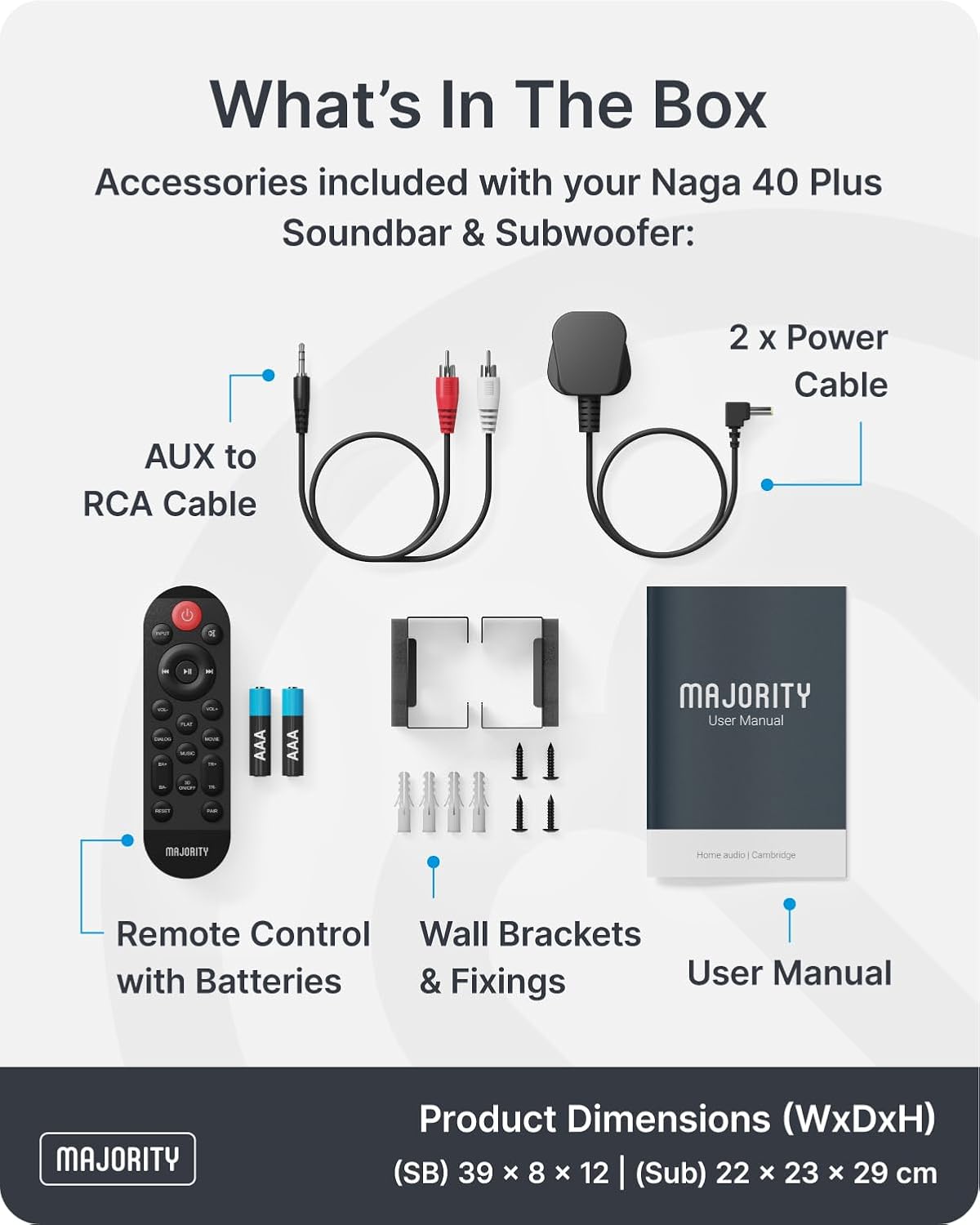 La caja incluye: barra de sonido Naga 40 Plus, mando a distancia (con pilas AAA incluidas), cable HDMI, cable AUX-RCA, adaptador de corriente, 2 soportes de pared, tornillos y tacos y guide de usuario.