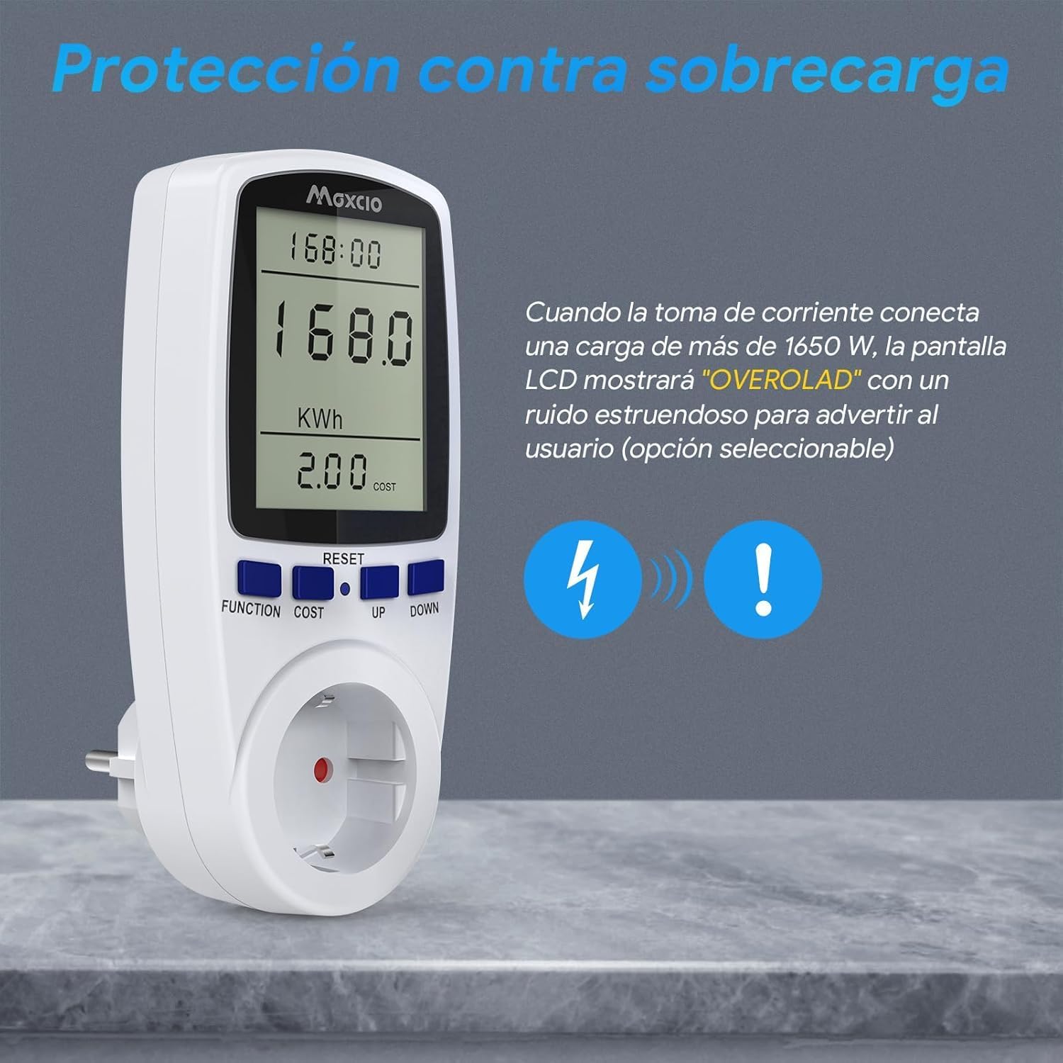 Maxcio Medidor de Consumo de Energía, Monitor de Electricidad Recargable con Pantalla LCD Retroiluminada, 7 Modos Medidor de Consumo Eléctrico con Protección contra Sobrecarga, Costo de Electricidad