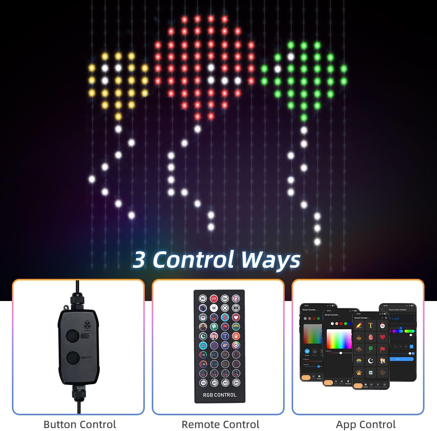 Sincronización de música en tiempo actual: La luz de cortina para fiestas al aire libre para Navidad viene con una paleta de 16 millones de colores, incluidos blancos cálidos y fríos, tienes la libertad de personalizar cada LED. Y el micrófono incorporado de alta sensibilidad asegura que las luces de cortina bailen al ritmo de la música, mejorando el ambiente festivo. ¡No solo escuches tus canciones, visualízalas con luces dinámicas!