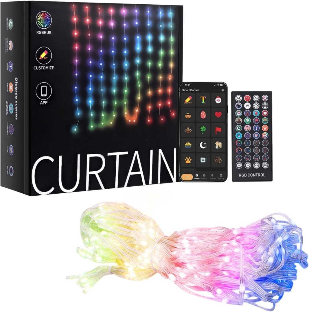 Programación y montaje fácil: Programa las luces de cortina para la sala de estar para encender o apagar y crear el fondo superb para una cita romántica o una reunión acquainted. Se instala fácilmente usando 22 ganchos. Midiendo 2.1mx 1.5m, estas luces en tira RGB interiores son perfectas para paredes de dormitorios, ventanas, salas de estar y espacios exteriores. ¡Mejora la decoración de tu hogar fácilmente!