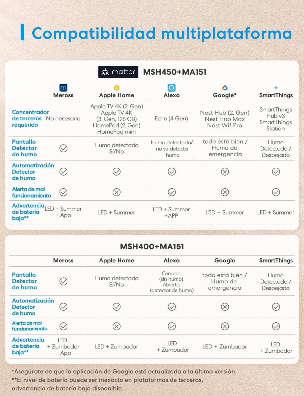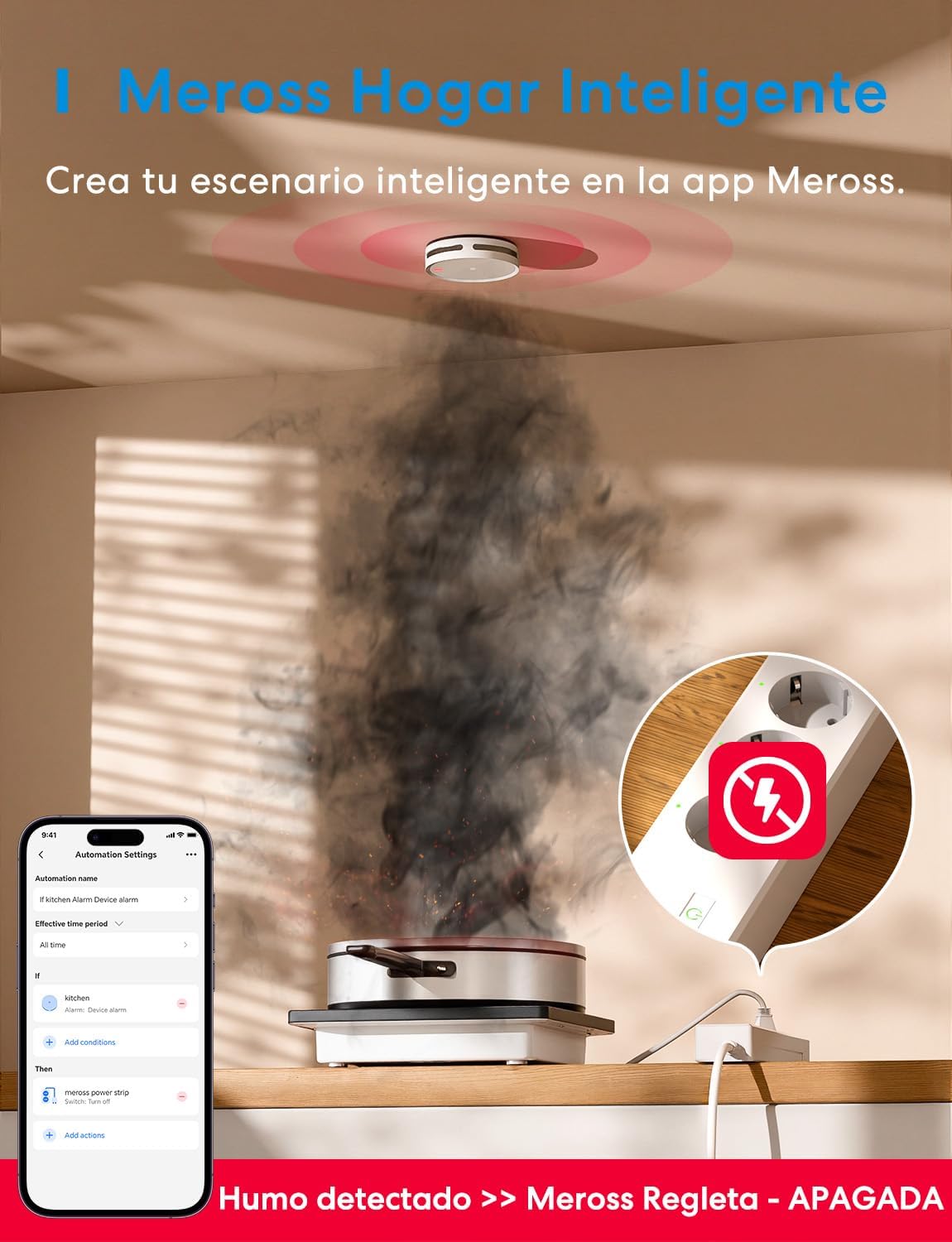 COMPATIBILIDAD CON MATTER, PROTECCIÓN INTELIGENTE FLEXIBLE PARA EL HOGAR: Appropriate con Matter, este detector de humo doméstico se puede integrar fácilmente con Apple House, Siri, Alexa, Google Assistant, House Assistant y SmartThings. Al detectar humo emite una alerta sonora y activa automatismos inteligentes. Se utiliza con enchufes inteligentes (frecuentemente adquiridos con otros dispositivos domóticos) para apagar automáticamente las fuentes de energía, reduciendo efectivamente el riesgo de incendios secundarios y reforzando la seguridad en la casa.