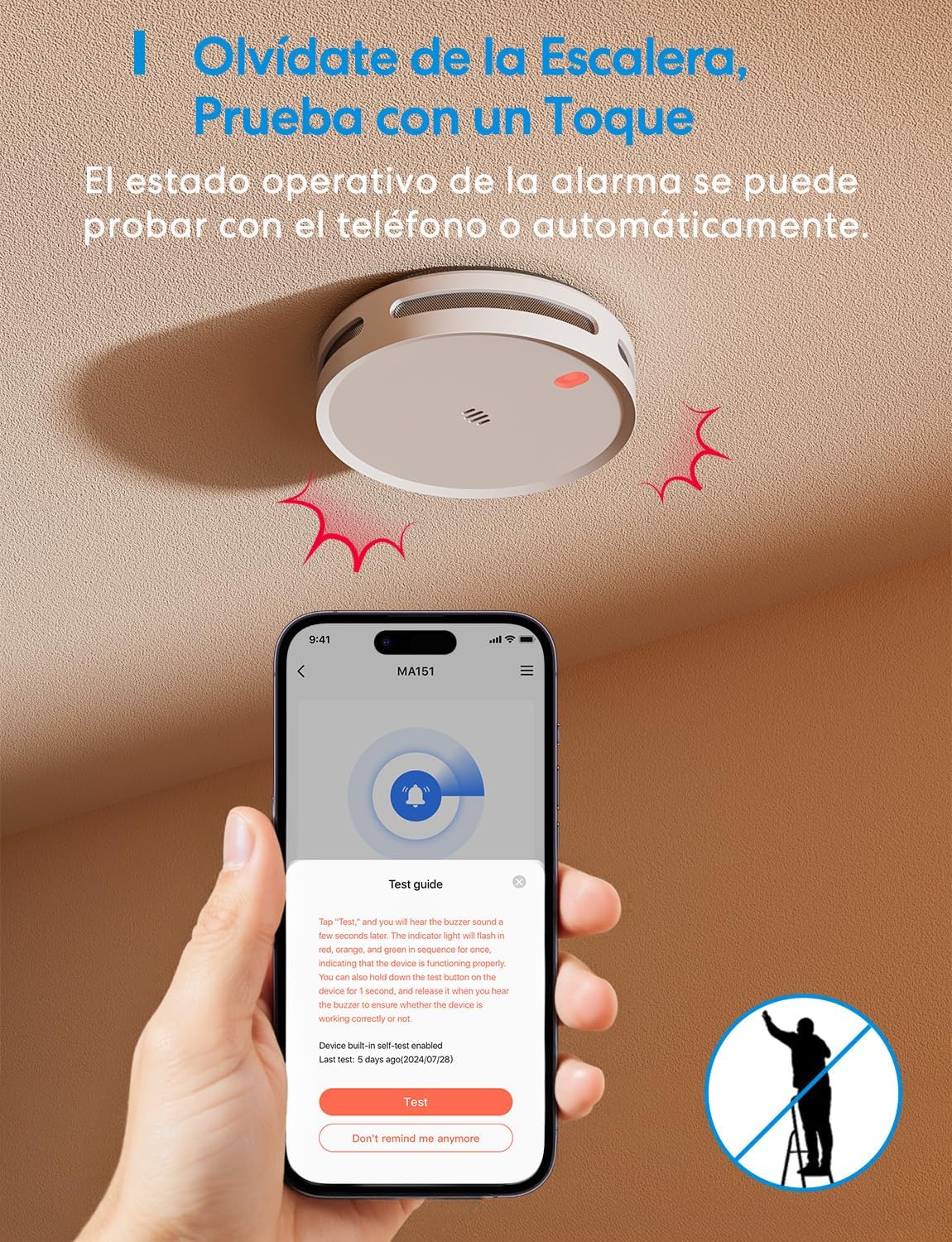 DISEÑO ULTRA DELGADO, FÁCIL INSTALACIÓN Y PRUEBA CON UN CLIC: Con solo 3,2 cm de altura, este sensor de humo se adapta a interiores modernos. Incluye tornillos y adhesivos 3M para un montaje versatile. Conexión WiFi rápida mediante botón de emparejamiento, y prueba sencilla desde la app, sin escaleras ni desmontaje.
