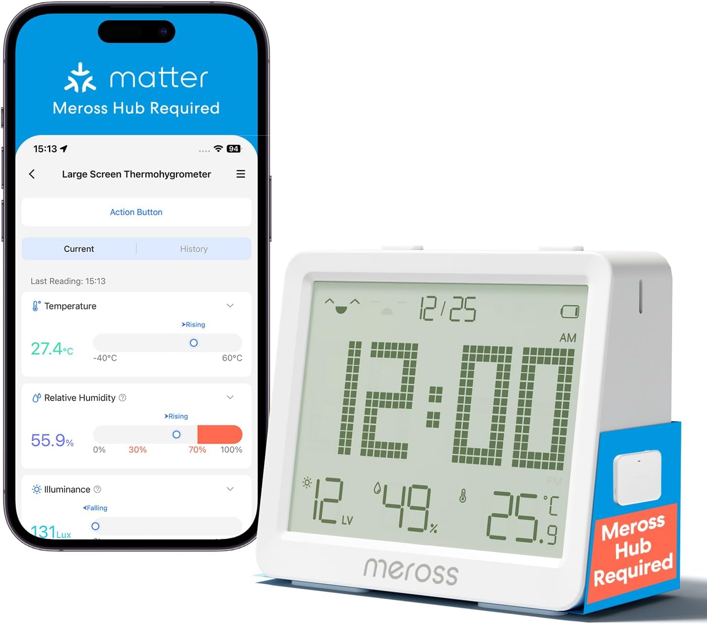 Pantalla grande y teclas de acceso rápido: higrómetro digital con pantalla LCD grande de 3,7 pulgadas actualiza información en tiempo actual cada 3 segundos, que puede mostrar completamente la temperatura/humedad/fecha/hora/iluminación/comodidad/electricidad y otra información. Hay dos teclas de acceso rápido en la parte superior del producto, que puede configurar Good Scene y activar con otras collection de productos Meross juntos. La batería súper larga de tres años es más ecológica y económica.