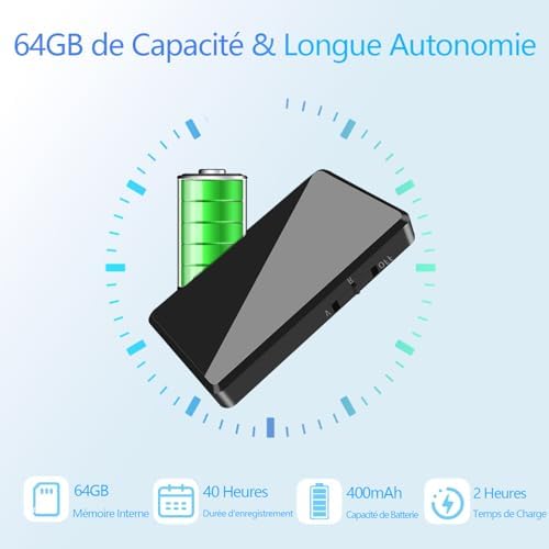 MEMORIA DE 64 GB Y BATERÍA DURADERA: ESTA MINI GRABADORA DE VOZ TIENE UNA MEMORIA DE 64 GB, Que Proporciona Suficiente Espacio de Almacenamiento pararabaciones MÁNGAS. La Batería Incorporada Está Full Cargada en 2 Horas. Puede Grabar Durante la Carga y Guardar Archivos Auticamete Cuando la Batería Está Baja. Además, Nuestra Grabadora se puede utilizar como una memoria USB para almacenar y hacer copias de seguridad de sus archivos, lo que le permita lllevar sus archivos un lugar de cualquier.