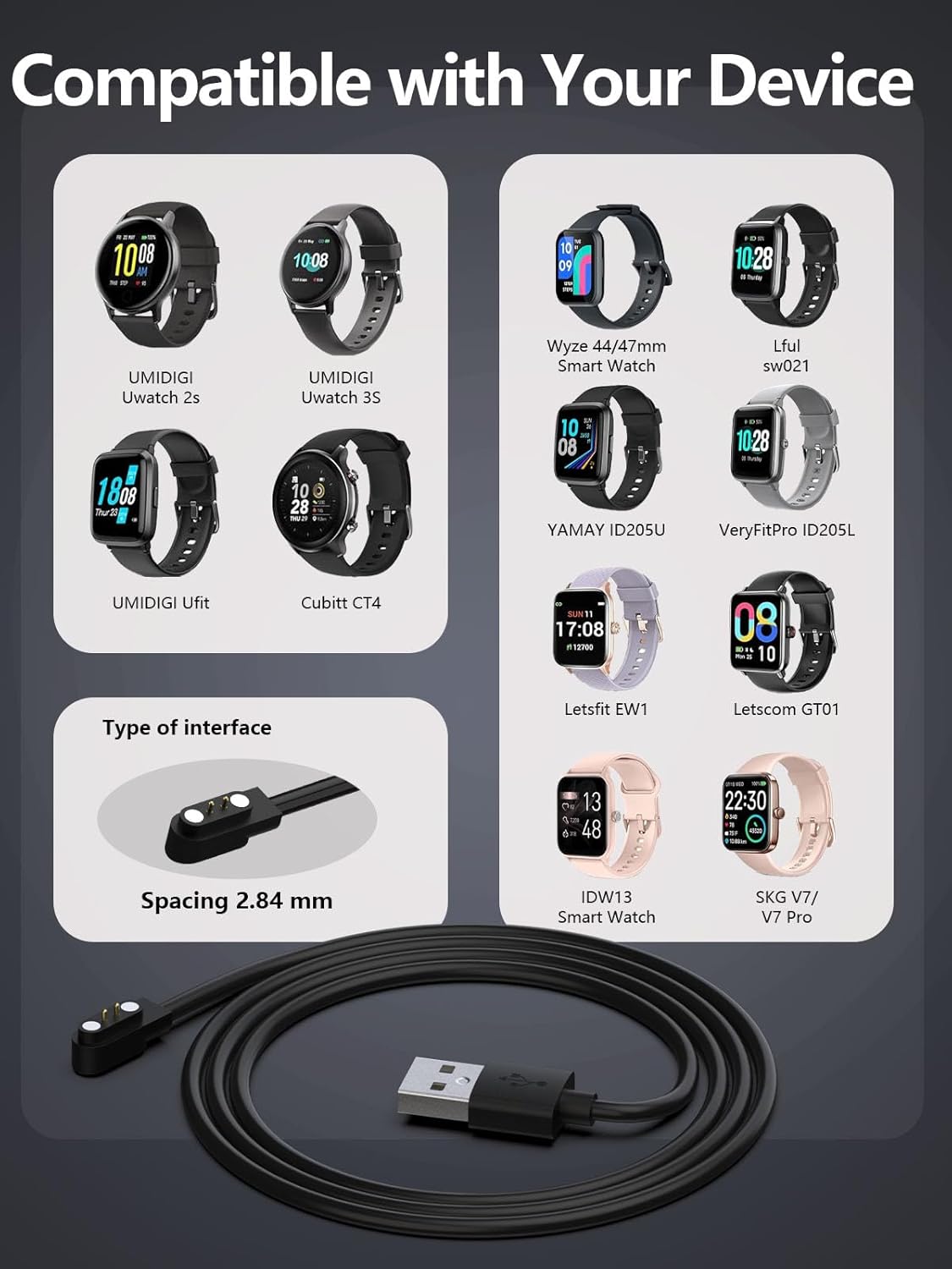 5V Smartwatch Magnética Cargador Compatibilidad: Suitable con YAMAY Blackview R3 R3 Professional X2 X1 para Willful SW021 ID205U ID205S ID205L ID216 SW025 SW01 SW023 para Uwatch 3 para Uwatch Ufit para Uwatch GT y otros relojes inteligentes Letsfit ID206 ID205L Blackview. Este cable cargador es appropriate con la mayoría de los relojes inteligentes que usan carga magnética.