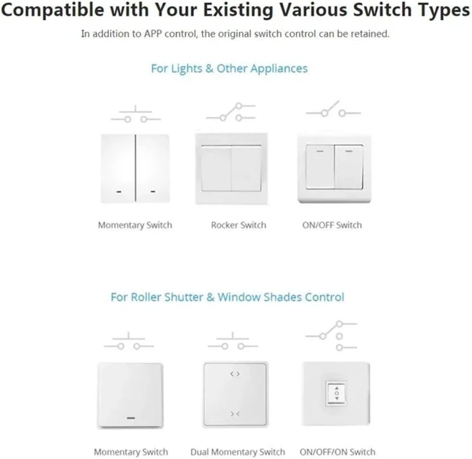 Integración Inteligente Para El Hogar: Transforma tu Hogar en un Espacio de Vida Inteligente Con el Interruptor Inteligente Wifi de Bricolaje. Este innovador apositivo le permito convertir Cualquier interruptor Estándar en un interruptor Inteligente, lo que permita el management remoto inalámbrico de luces y electrodomísica a Través de supositivo móvil o comandos de voz para una integración perfecta en su sistema de hogare.