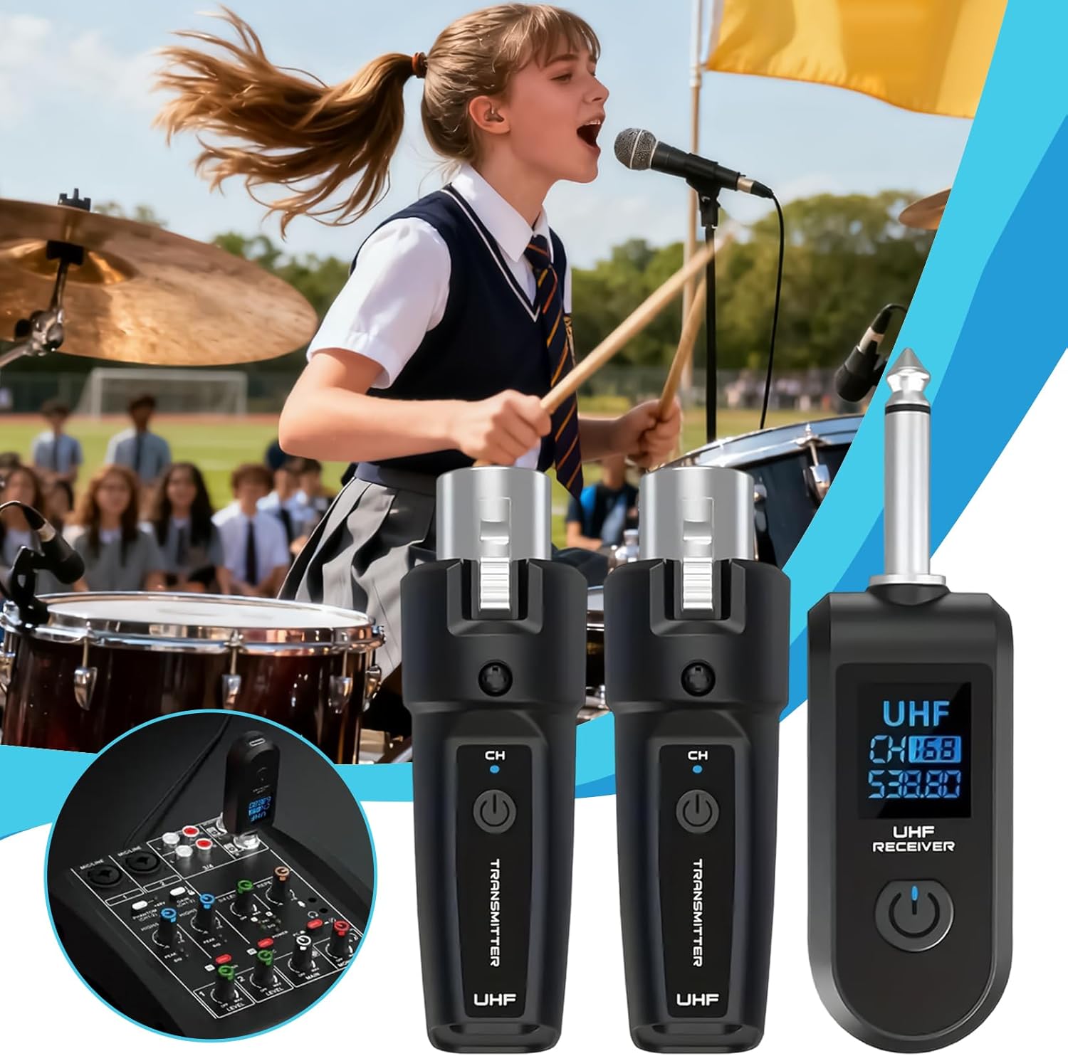 Experiencia inalámbrica sin problemas: el receptor de micrófono inalámbrico admite un alcance estable de 15 metros y promueve la libertad inalámbrica, dando a los usuarios la oportunidad de disfrutar de un movimiento sin restricciones en el escenario al tiempo que simplifica los procesos de configuración para actividades como conferencias o producciones teatrales.