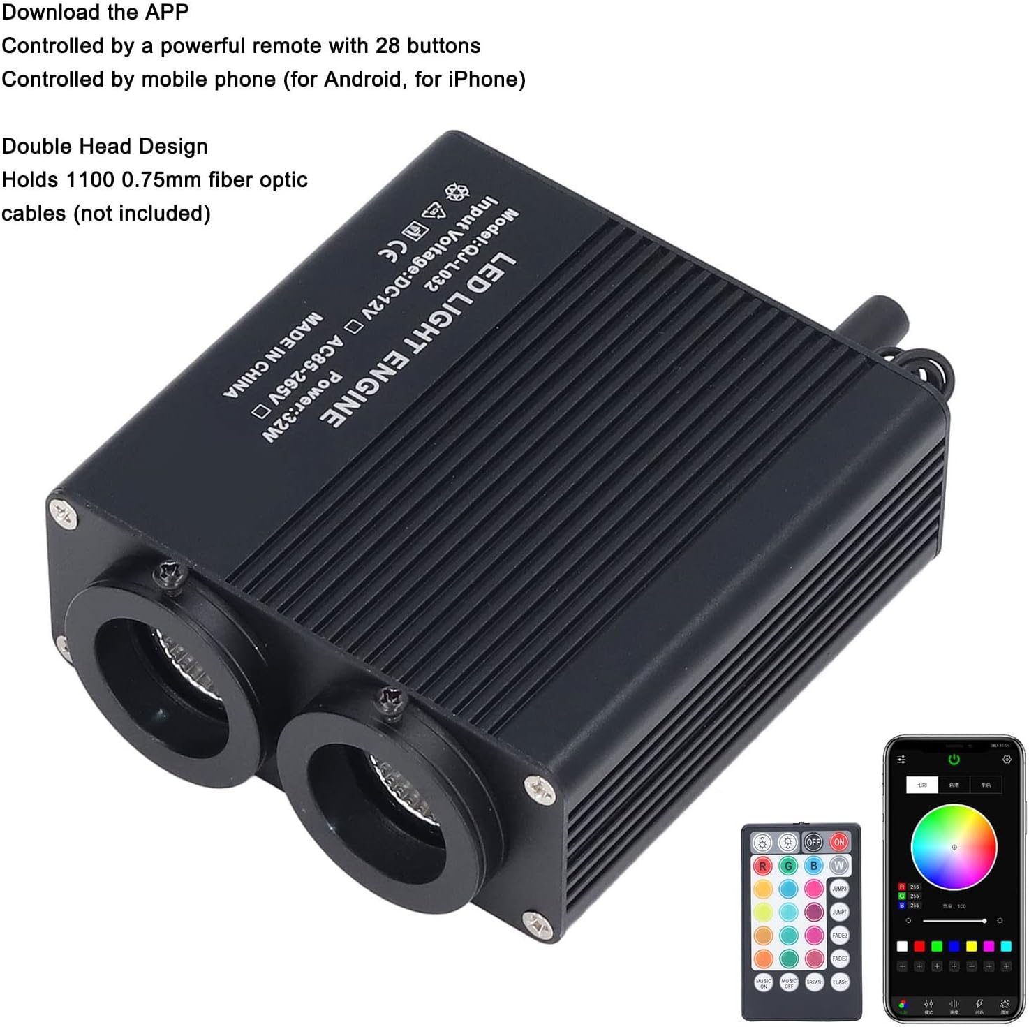 Aplicación para teléfono móvil y management remoto: El Motor de Luz de Fibra óptica se controla Mediante Teléfono MÓVIL PARA, PARA, SILLEME DESCARGER LA APLICACACIÓN Y ENCIÉNDALO. También VIENE CON POTENTE MANDO A DISTANCIA DE 28 BOTONES PARA SU CONTRA. Es muy conveniente Controlar El Motor Ligero.