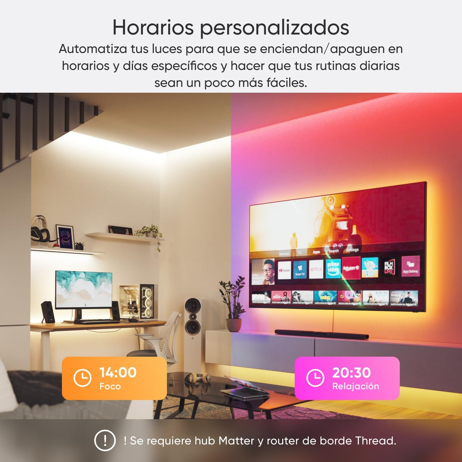 Los Nanoleaf Necessities aumentan sus necesidades de iluminación diaria. Crea una iluminación retroiluminada impresionante en cualquier habitación con esta tira de luz LED inteligente con cambio de coloration Nanoleaf Matter. Incluye un controlador. – Funciona con Matter a través del hilo. – Controla a través del controlador, la aplicación o la voz. – Versatile y fácil de recortar. – Más de 16 millones de colores y blancos ajustables. – Más personalización mediante la aplicación Nanoleaf. Requiere un hub doméstico inteligente suitable con Matter para el ecosistema deseado y un router Thread border. Estos requisitos pueden cumplirse actualizando un hub doméstico inteligente que ya tenga en casa. También se puede utilizar Bluetooth para los controles básicos con la aplicación Nanoleaf. Ejemplos de concentradores domésticos inteligentes compatibles con Matter incluyen pero no se limitan a: – Apple HomePod mini, Apple TV 4K (2ª generación) y (3ª generación) Wi-Fi + Ethernet. – Google Residence Mini, Nest Mini, Nest Hub (1ª y 2ª generación), Nest Hub Max. Ejemplos de routers Thread border incluyen, entre otros: – Apple HomePod mini, Apple TV 4K (2.ª generación) y (3.ª generación) Wi-Fi + Ethernet. – Google Nest Hub (2ª generación), Nest Hub Max. – Líneas, formas y elementos Nanoleaf.