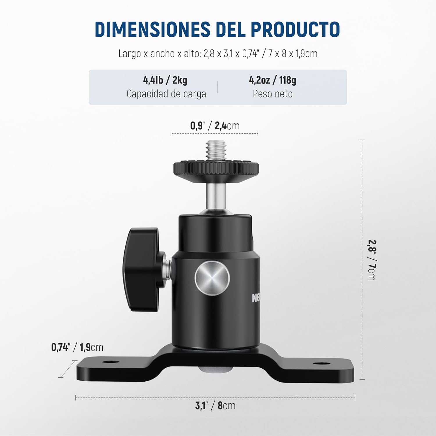 【Cabezal de Bola Desmontable】 El cabezal de bola con rotación de 360° e inclinación de 90° ofrece cualquier ángulo necesario. Sepárelo quitando dos tornillos y use el perno de 5/8″ oculto en el inside