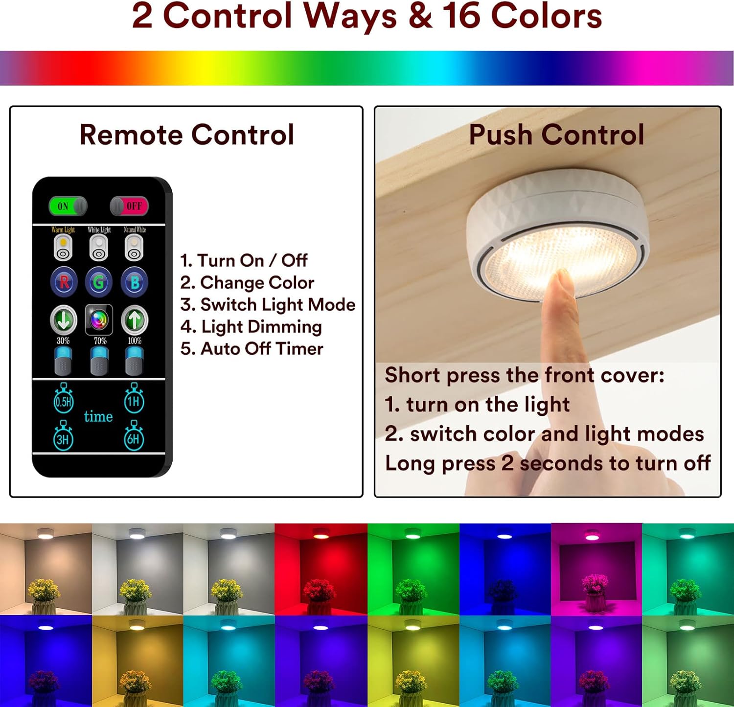 Además del blanco cálido más utilizado, blanco pure y blanco frío, estas pequeñas luces proporcionan 13 colores de luz adicionales en modo estático, es una decoración ligera perfecta para su vinoteca, vitrinas, and many others. Los 4 modos de luz dinámica crean un ambiente de iluminación. de vacaciones y fiestas para ti.