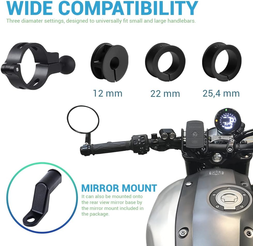 Amplia compatibilidad: las juntas del paquete garantizan que el soporte del teléfono se ajuste perfectamente a la abrazadera common del manillar con diámetro. 22 m, 25 mm, 32 mm en motocicleta, motocicleta, ATV, ciclomotores, scooter de movilidad, soporte para teléfono eléctrico. Además, el extensor de espejo retrovisor viene con el artículo de diámetro. Montaje en tubo de espejo retrovisor de 1 cm.