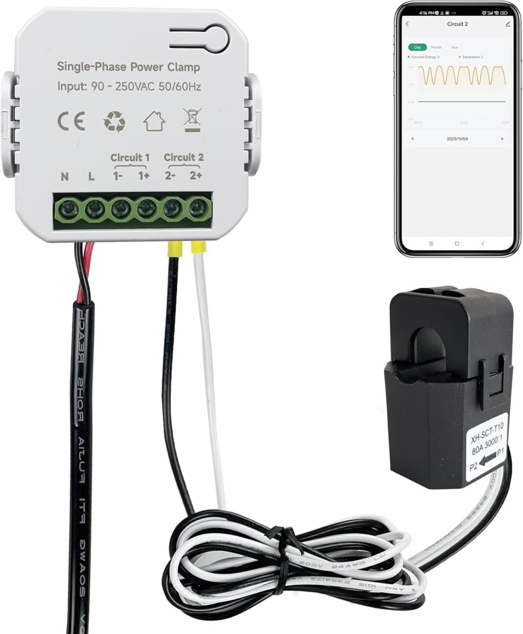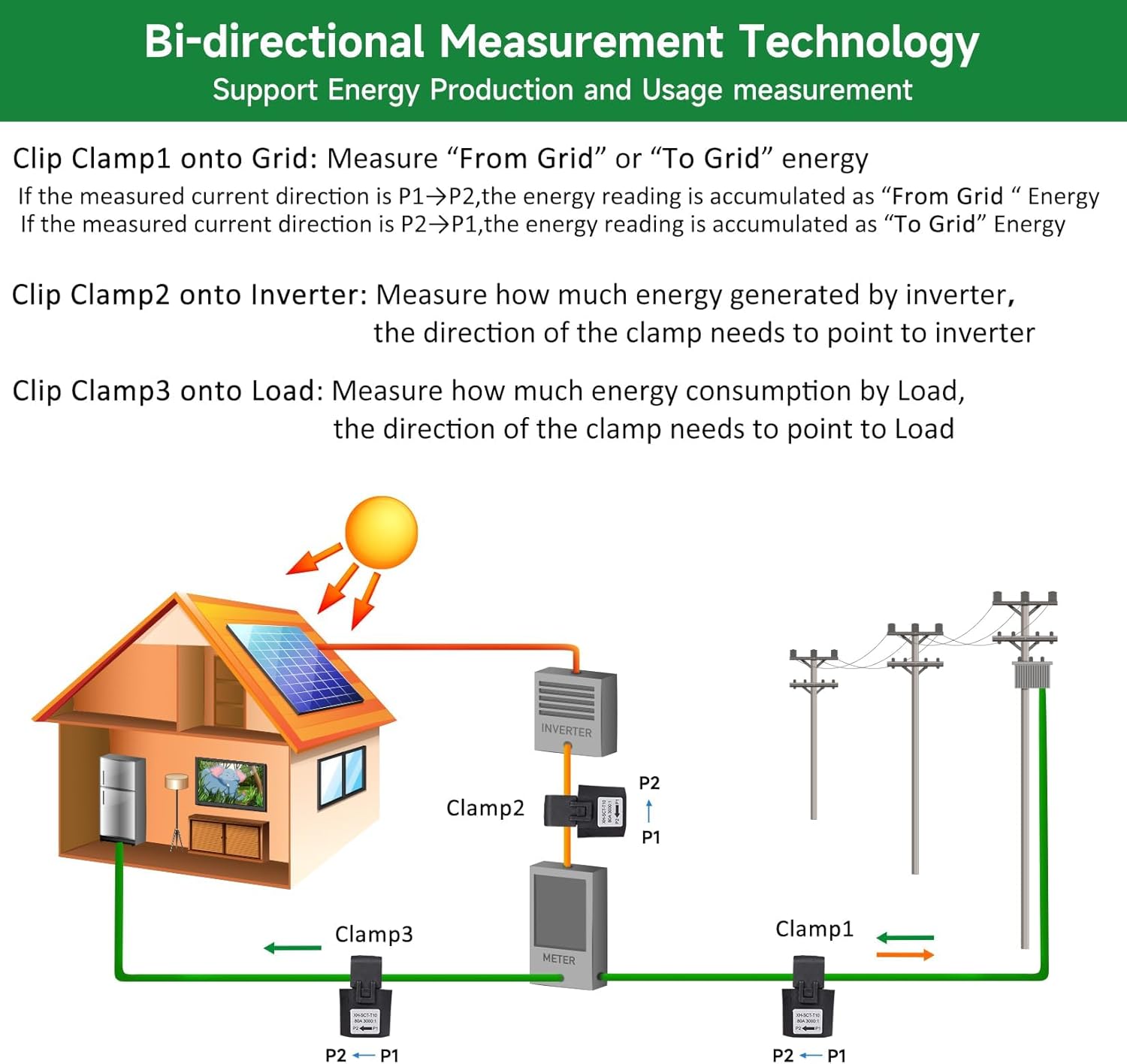 Tecnología de medición bidireccional: el monitor de energía doméstica soporta la producción de energía y medición de uso (80 A, con 1 abrazadera). Rastrea las tendencias energéticas por día, semana y mes. Appropriate con electricidad monofásica. Soporta medición de potencia en cada canal (2 canales en la misma fase).