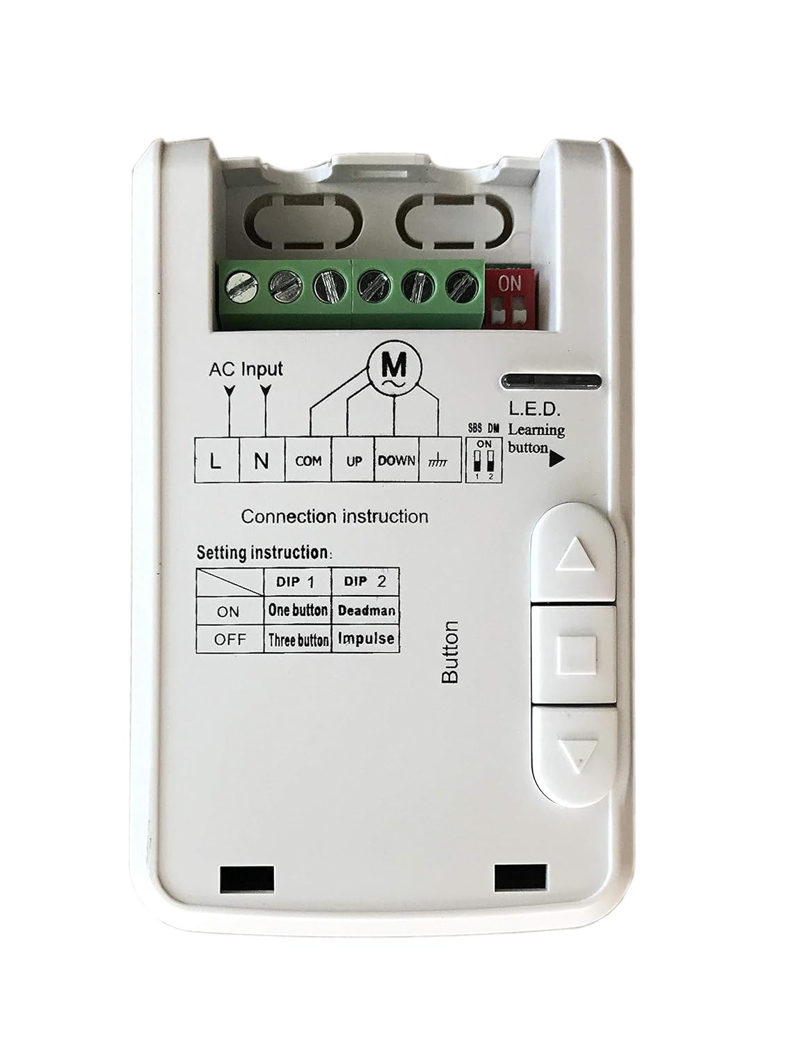 No se dispone de entradas para fotocélulas y luces intermitentes, por tanto, no se aconseja su uso en perseia de garajes. AlimentAción: 220 V. Capacidad del Motor: 0,5 hp (Caballos de Fuerza). Apto para Cualquier Tipo de Motor Tubular. La Unidad Dispone de Un fusible de Protección y Un Recibidor de Radio de 433 MHz Código de rodadura que proporcionan la Máxima Seguridad. Un interruptor de Través del Dip (micro-interrfumores eléctricos encapsulados) es posible selección y Ajustar el funciones de mandos a distancia de 1 botón (abrir, detener y cerrar en secuencia con el misme botón) para poder dirigir con el mismo mismo a el distancia a distancia 3 uncentrales (qualestades 3 centhentades (quala 3 qualess) Podrán adquirir por separado) o el Ajuste de Tres Botones (Abrir, Detener y Cerrar Con 3 Botones Diferentes). También es posible seleccional la modalidad de modalidad.