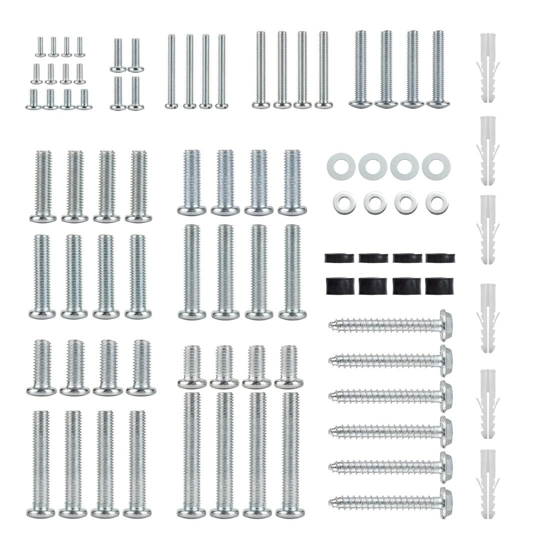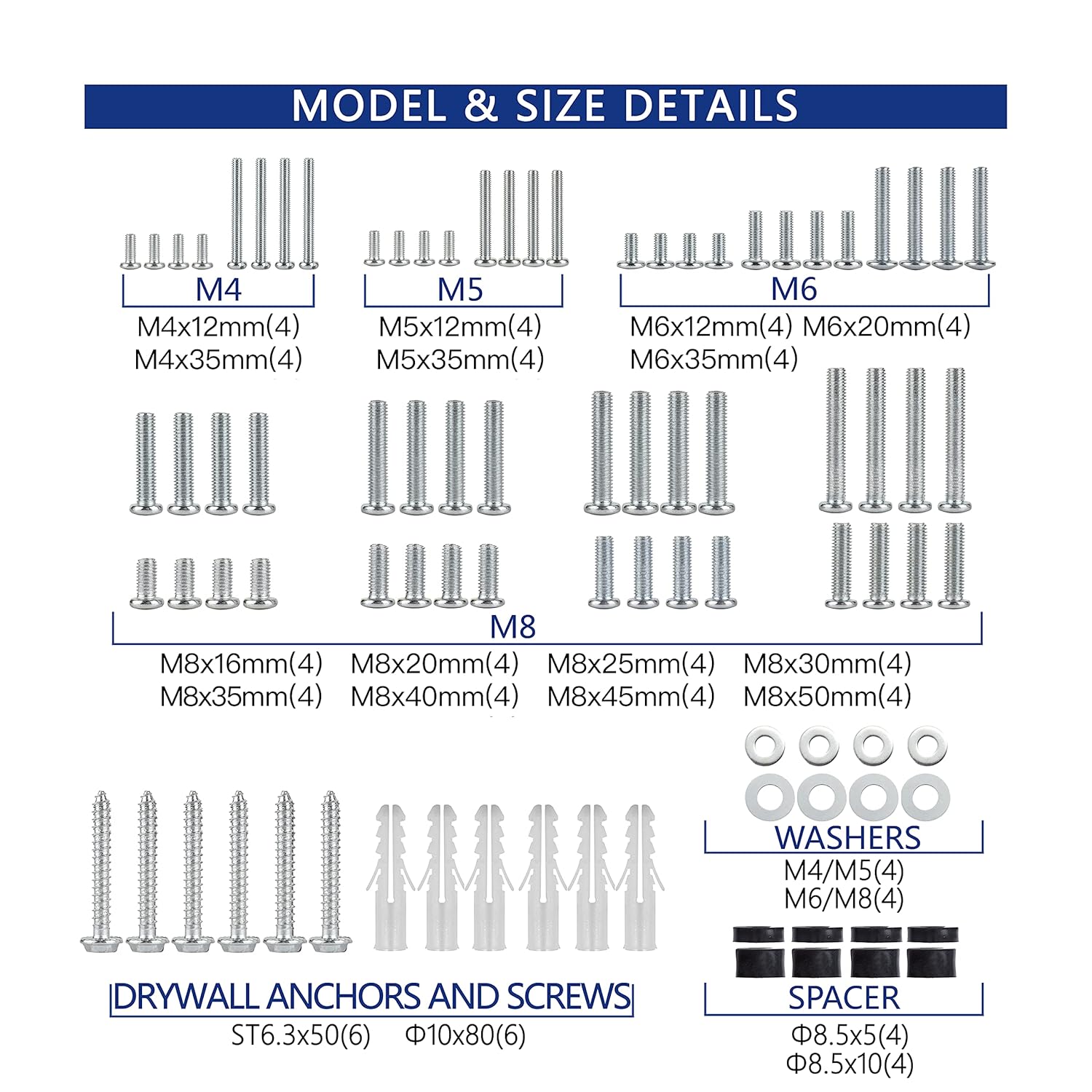 El paquete incluye: 60 tornillos de TV, 8 arandelas, 8 espaciadores, 6 tornillos de yeso y 6 anclajes. Este paquete de TV te asegurará que puedas montar fácilmente y suavemente tu televisor.