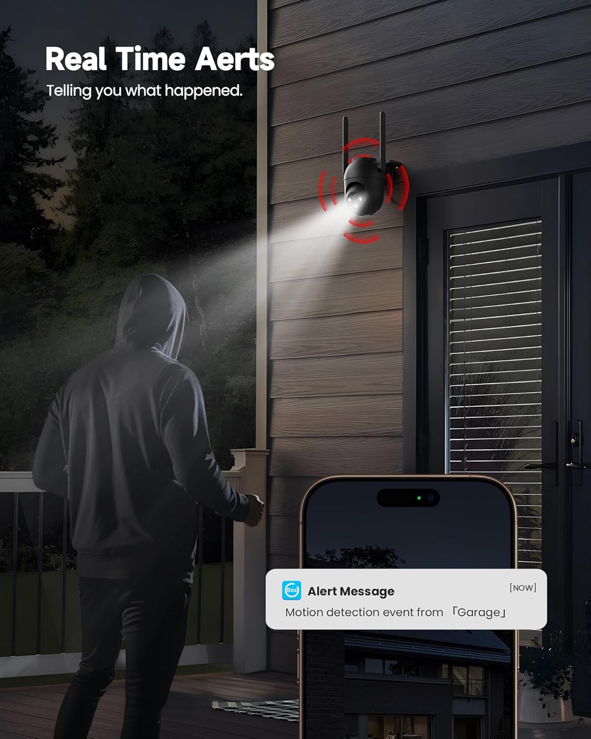 【Video 24/7】 Grabación de vídeo continua 24/7, día y noche, manténgase siempre alerta y proteja su seguridad private. Usted recibirá inmediatamente un mensaje de alerta en su teléfono móvil, y la cámara también emitirá una alarma audible y visible para ahuyentar a cualquier visitante no deseado (alarmas audibles y visuales sólo son eficaces por la noche).