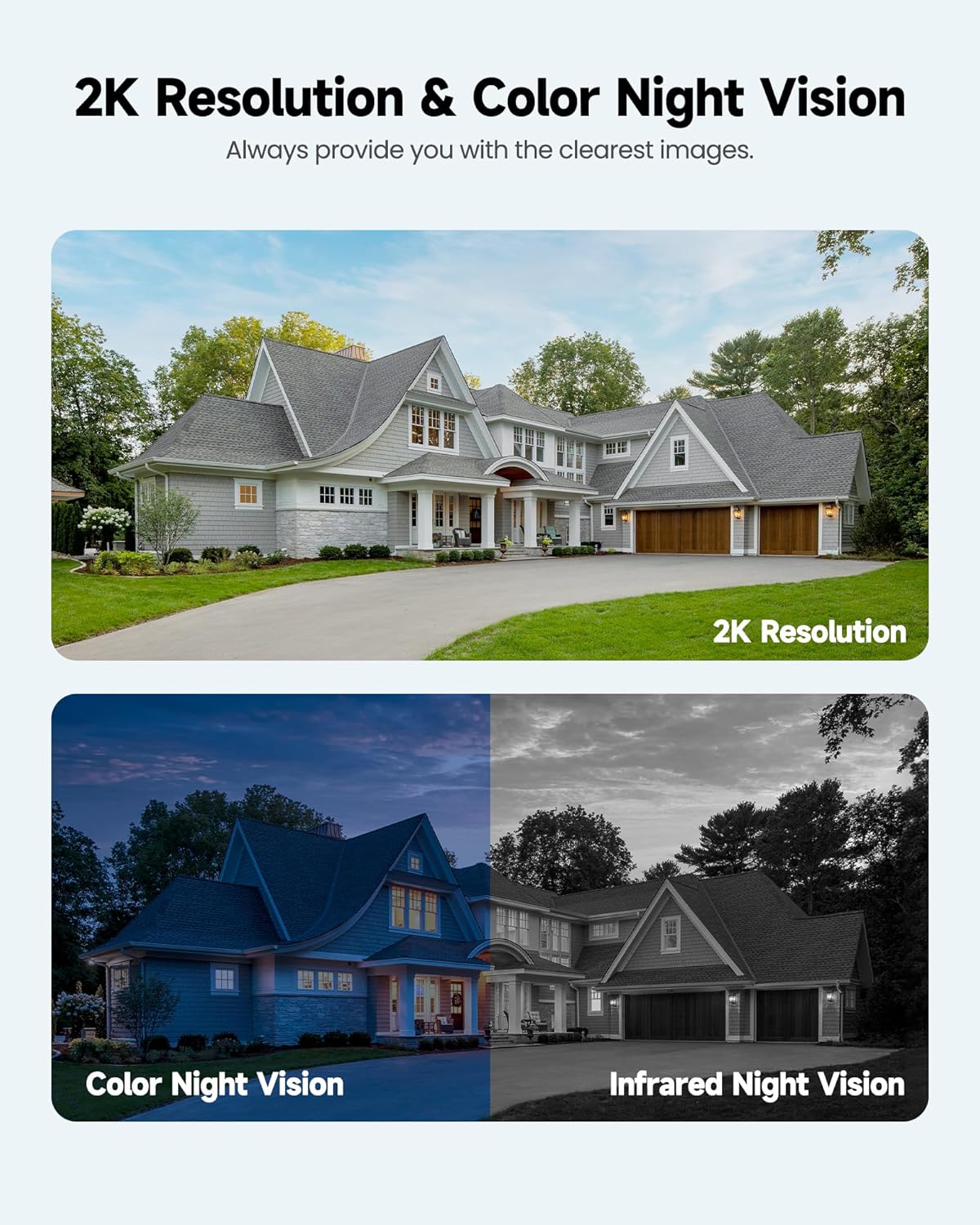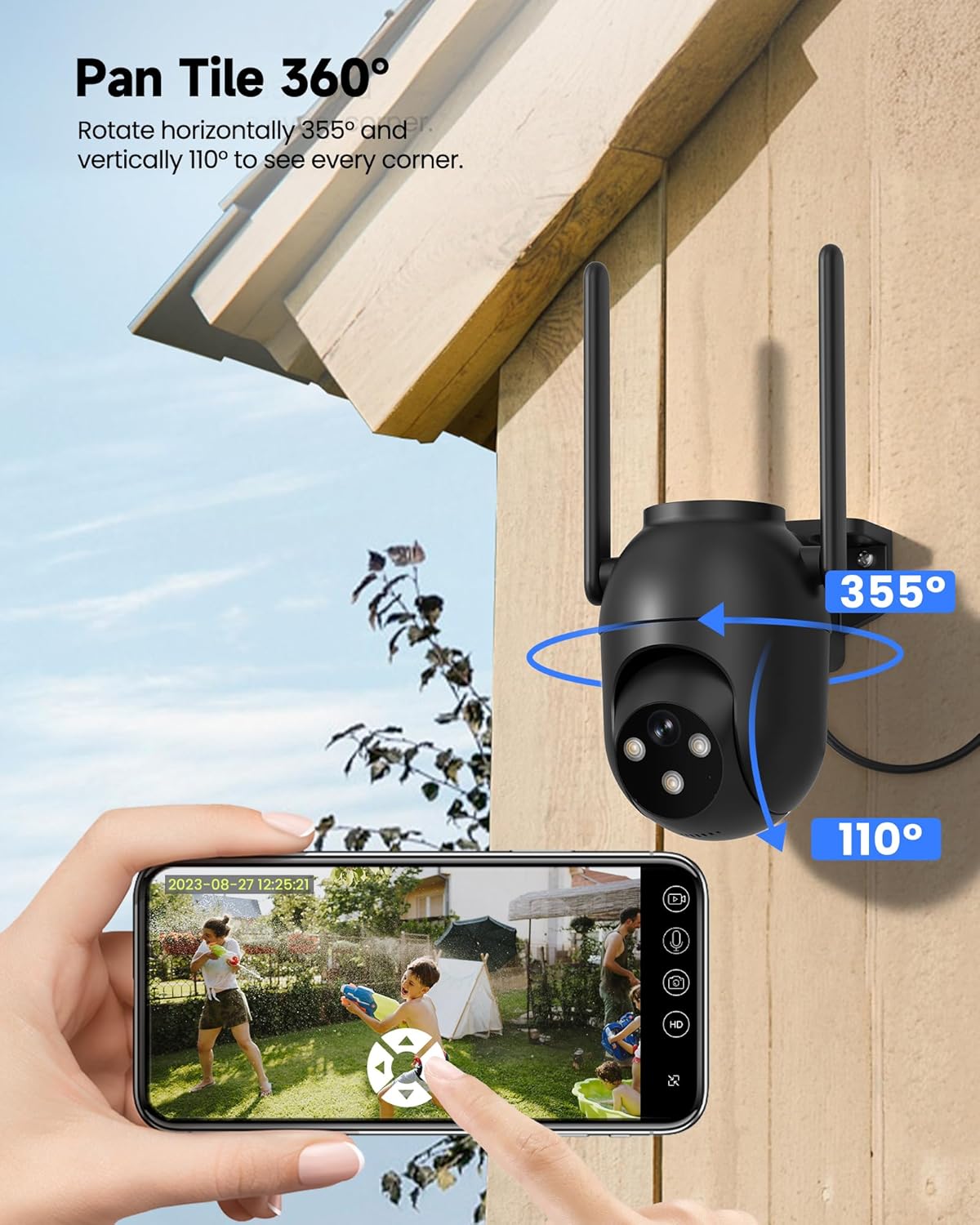 【Calidad de imagen 2K y vista 360°】Camara de vigilancia exterior/inside captura fotos y movies 2K 24/7 con función de panorámica de 355° e inclinación de 120°, lo que le permite acceder a ella de forma remota en cualquier momento. Sensor de imagen HD 2K incorporado y reflector, la cámara puede reconocer claramente las caras durante la transmisión en vivo. Con visión nocturna en colour, garantiza una visibilidad de 10 m incluso en la oscuridad.