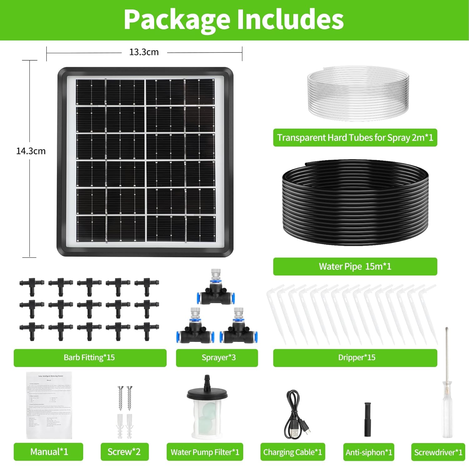 【Productos incluidos】El package de riego photo voltaic incluye 1 panel photo voltaic, 15 metros de manguera negra (para riego por goteo), 15 racores de lengüeta, 15 puntas de goteo, 1 filtro, 1 antisifón, 3 pulverizadores, 2 metros de manguera transparente (para riego por aspersión), 1 cable de Carga, 1 guide de instrucciones.
