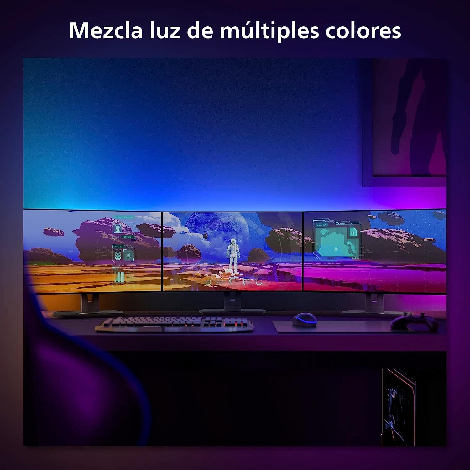 La tira de luces LED Hue Play gradient lighttrip para PC está disponible en tres tamaños para configurar un único monitor y tres monitores e incluye clips de montaje, lo que facilita la conexión a la parte posterior del monitor.