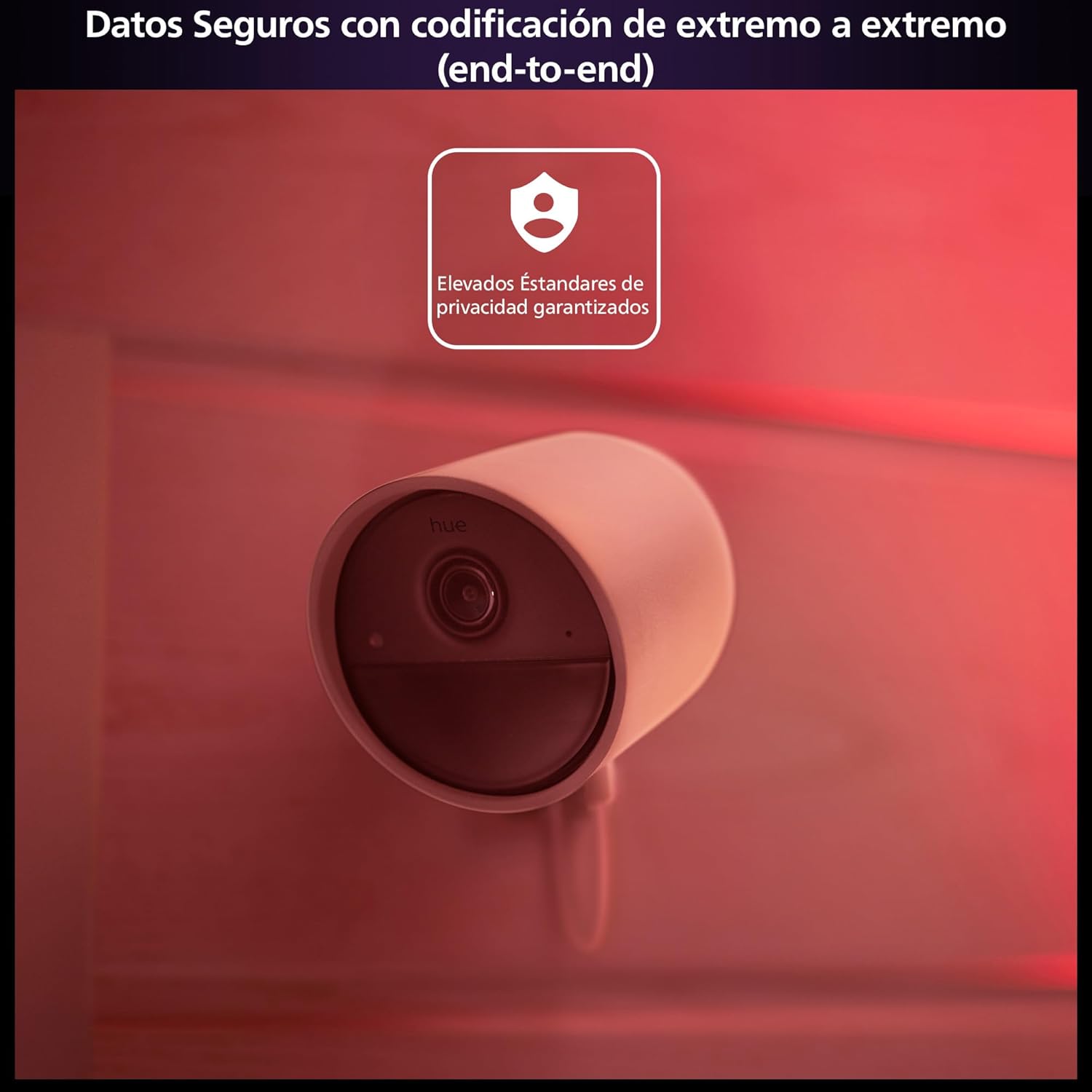 Haz que parezca que estás en casa cuando no lo estés; Utilice la cámara de videovigilancia segura Hue con Mimic Presence Automation y energetic la función de conversación bidireccional para proteger su hogar y tranquilizarse mientras no está en casa.