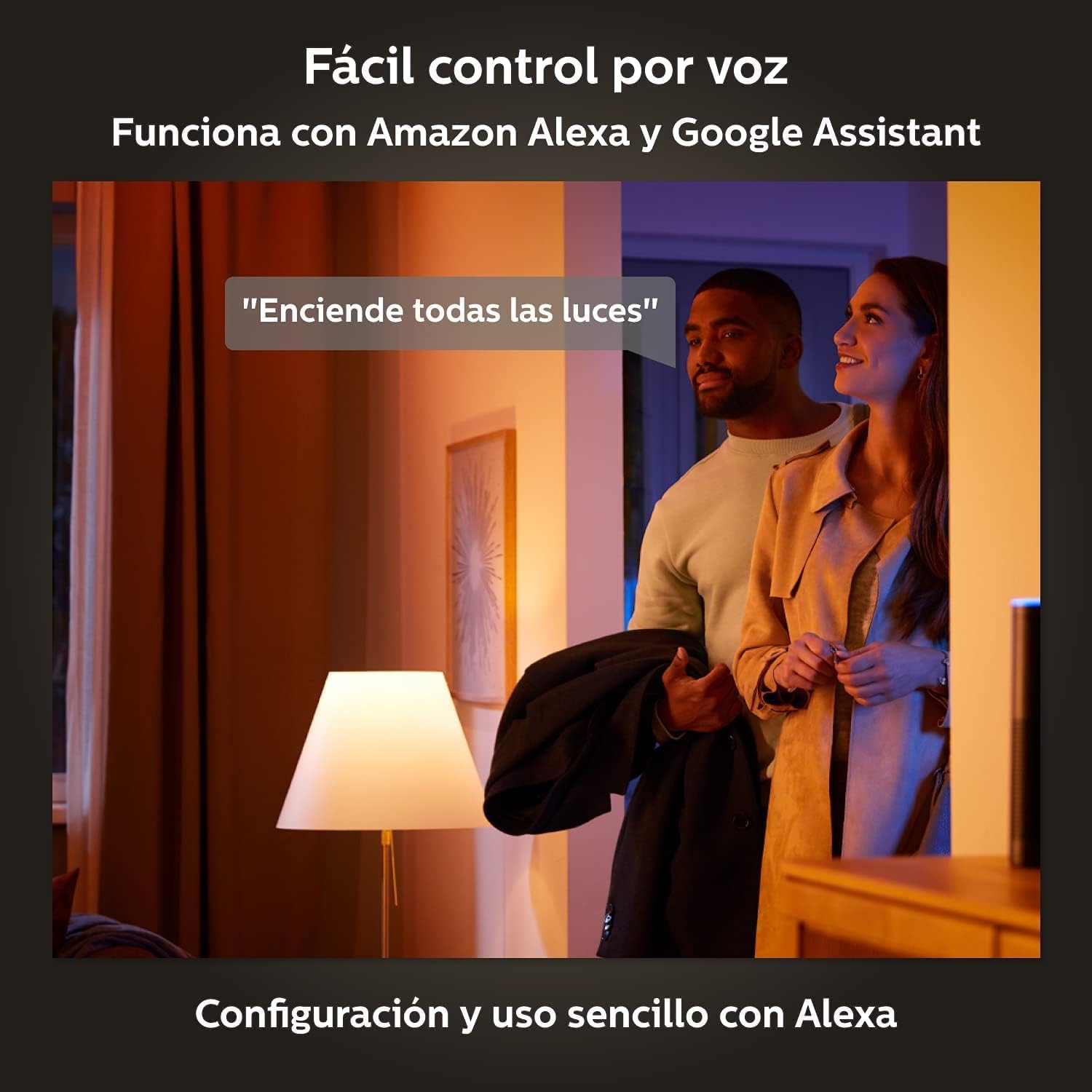 Management por voz: Philips Hue funciona con Amazon Alexa y el Asistente de Google en combinación con un dispositivo appropriate con Google Nest o Amazon Echo. Con comandos de voz simples se pueden controlar varias luces en una habitación o solo una lámpara.