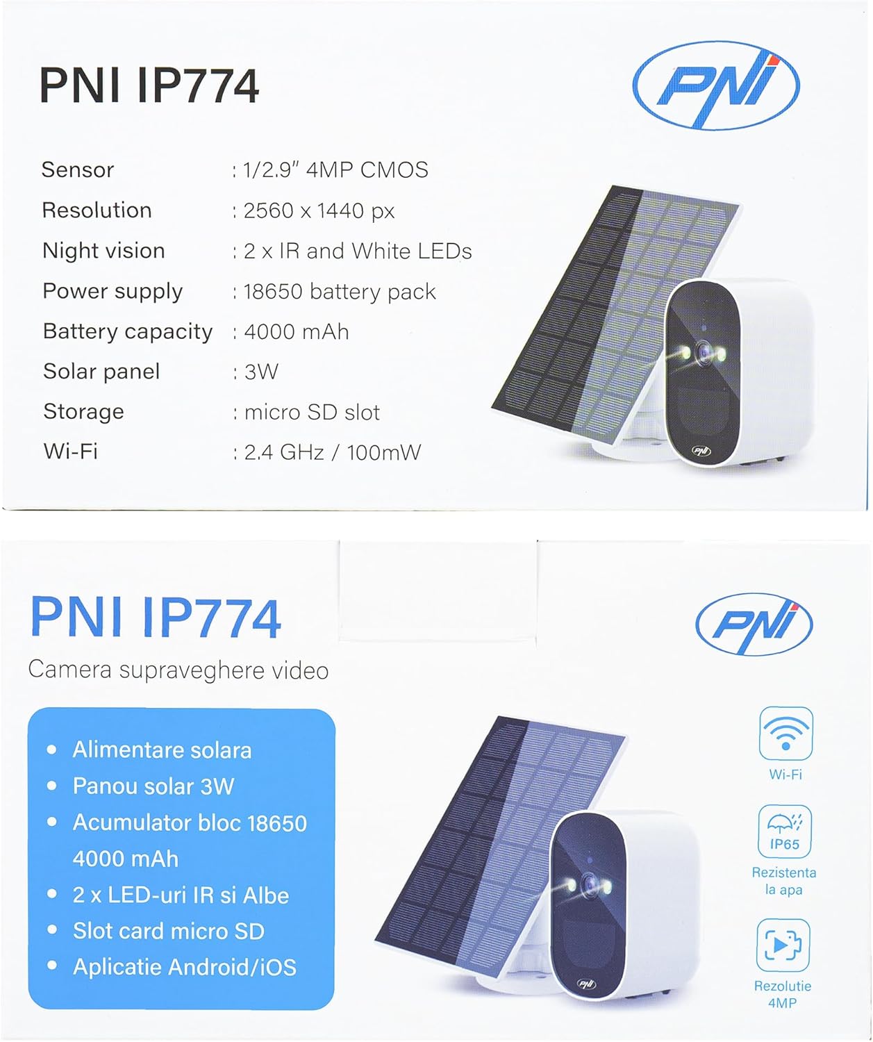 PNI IP774 Cámara de videovigilancia de 4 MP, Panel Photo voltaic de 3 W, batería integrada de 4000 mAh, detección de Movimiento, Ranura para Tarjeta Micro SD, visión Nocturna, Audio bidireccional