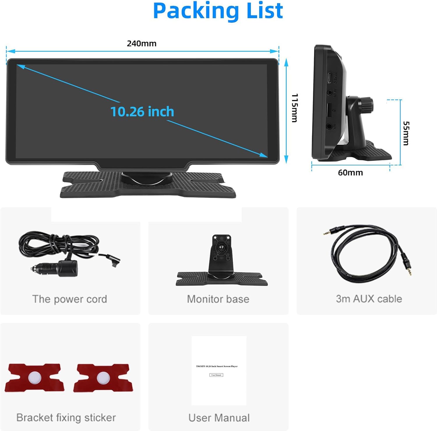 10,26-Pulgadas Portátil Radio de Coche Soporte UniversalManual de UsuarioEnchufe del Encendedor de CigarrillosEnchufe de Conversión del Encendedor de Cigarrillos (opcional)AUX Cable