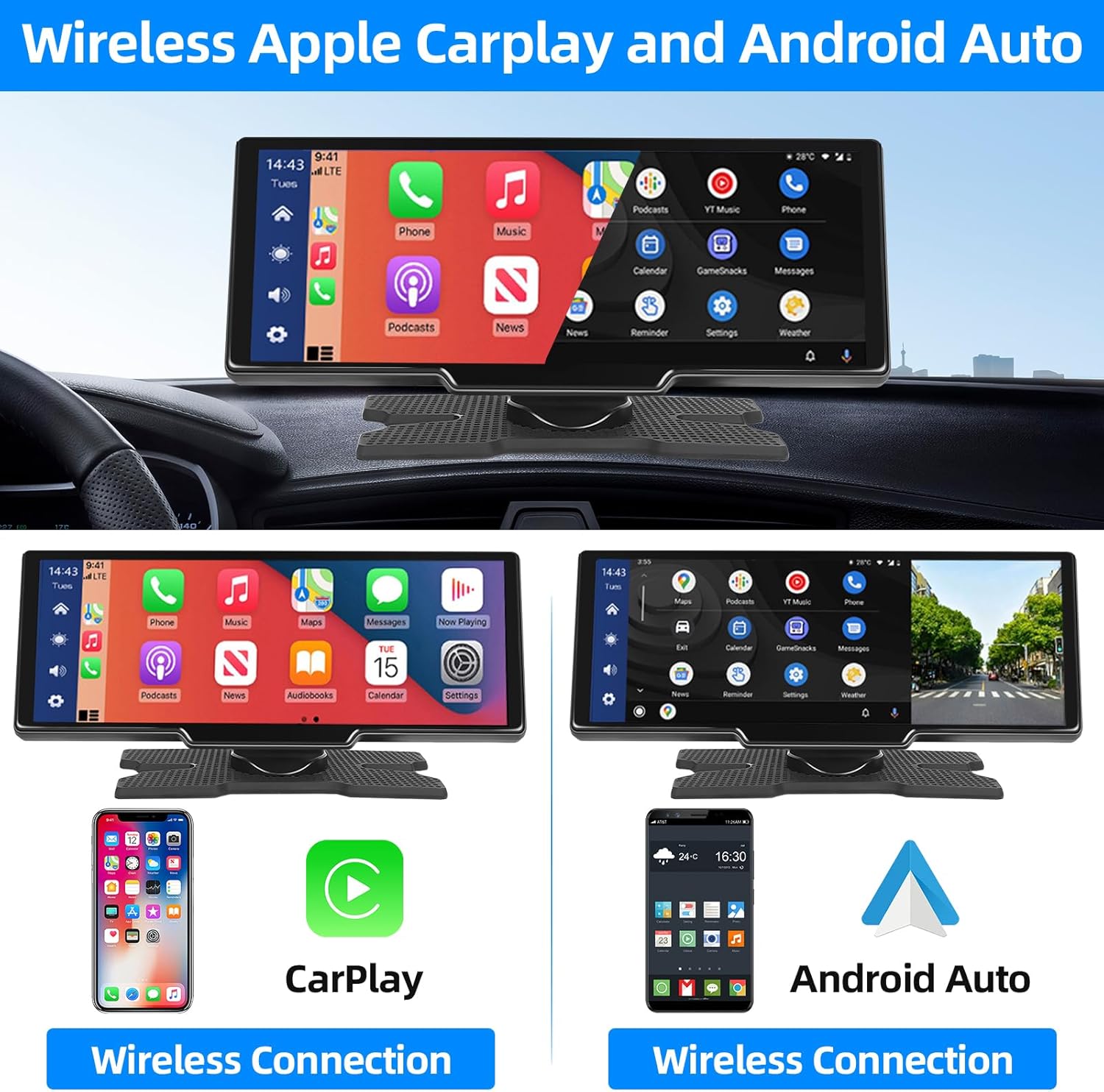 10,26 Pulgadas Radio Portátil de Coche Inalámbrica Apple Carplay y Android