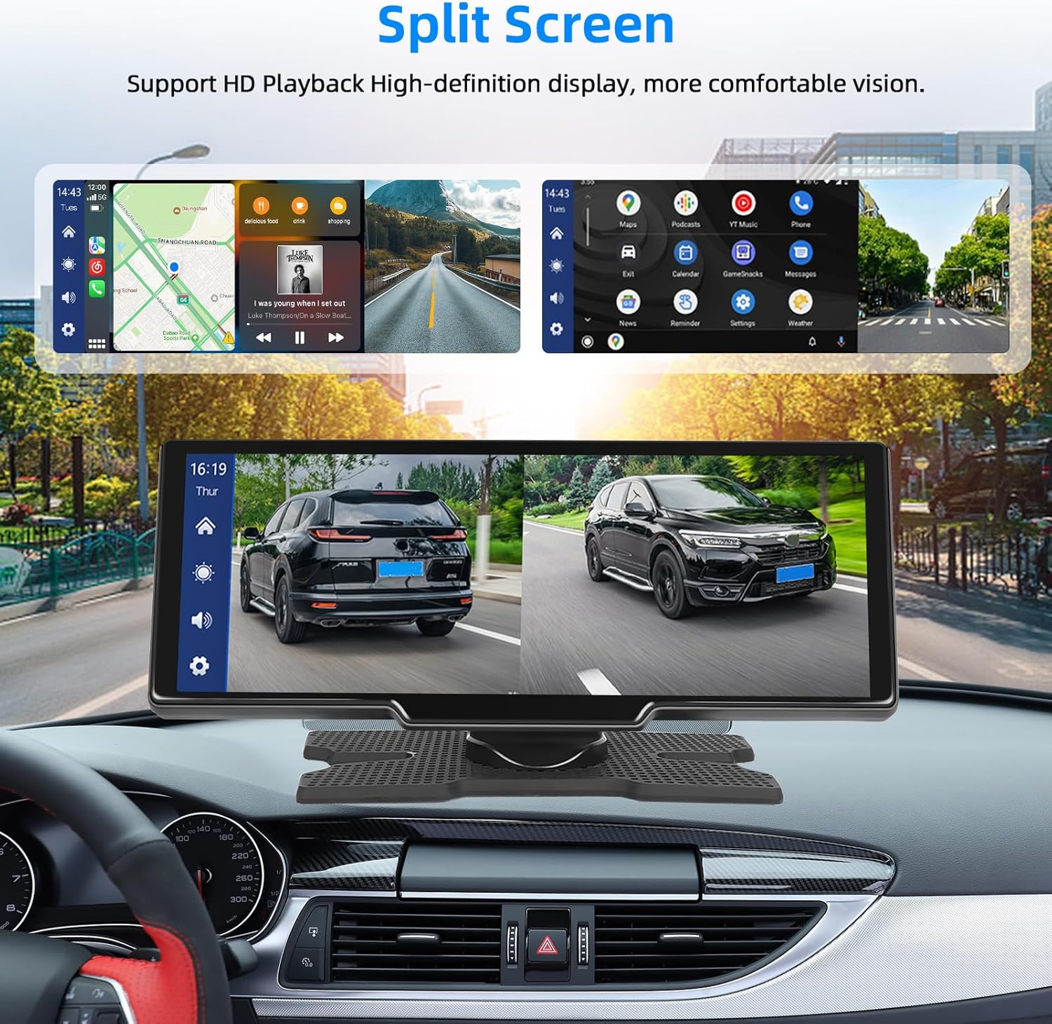Admite dos interfaces al mismo tiempo, puedes ver la pantalla de la cámara delantera y trasera al mismo tiempo. También puedes utilizar la navegación y reproducir música al mismo tiempo.