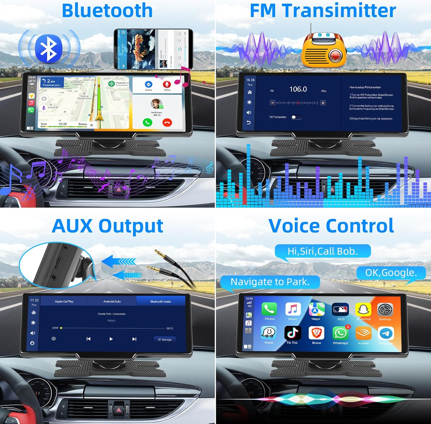 – Radio de coche de 10,26 pulgadas con pantalla táctil – Admite función de management de voz y entrada de micrófono – Manos libres Bluetooth/reproductor de música/carga de directorio – Admite conexión inalámbrica Apple Carplay, Android Auto y Mirror con teléfonos Android e IOS – Admite entrada de vídeo de cámara trasera- Admite cargador de automóvil para automóvil y camión de 7-32 V y cargador de encendedor de cigarrillos gratuito- Admite una selección de efectos de sonido EQ y conexión de subwoofer