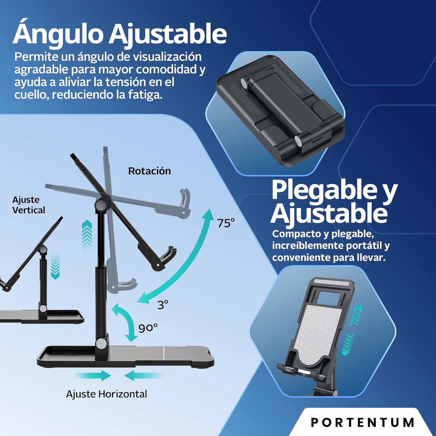 Diseño Portátil: Este soporte se puede plegar completamente, facilitando su transporte en cualquier bolsillo o mochila.