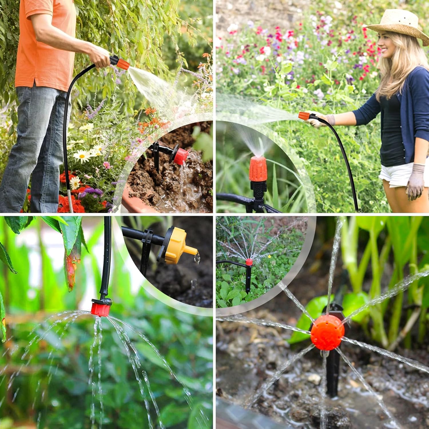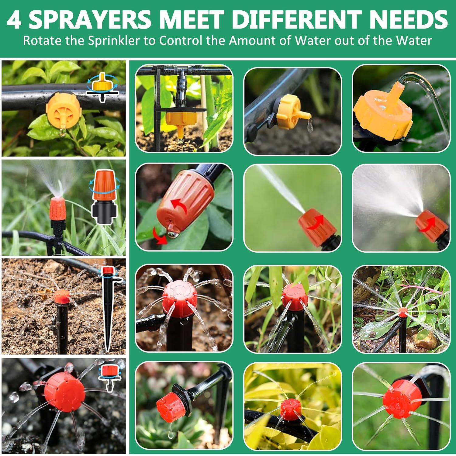 El Sistema de Riego Está Equipado Con Una Conexión Roscada «Common» que se adapta a la Mayoría de Grifos Con Rosca externa. VIENE CON 4 TIPOS DE PULVERIZADORES. CADA BOQUILLA Y GOTERO SE PUEDEN AJUSTAR A SUS NECESIDADES PARA GARANTIZAR UN RIEGO PRECISO PARA CADA Planta. Simplemente Gire La Boquilla de Goteo en Sentido Antihorario para drenar el Agua Que Gotea.