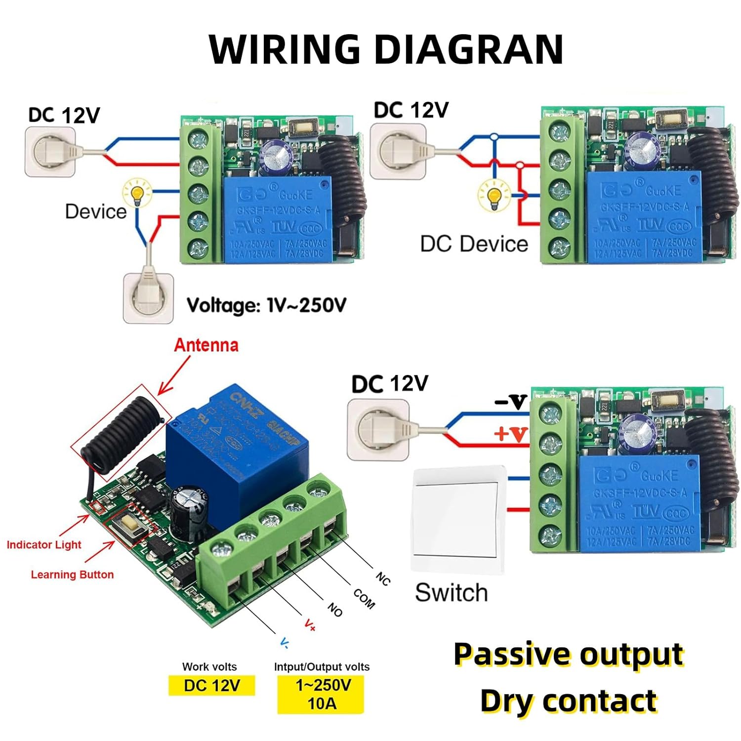 【Management Versatile】 Management Confiable, El Rele Inalambrico 12V Funcion Solo Conse Con El Transmisor Que USA El Mismo Código. Uno / Varios Transmisores Pueden Controlar Uno / Varios Receptores simultánaente, lo que permita un management Un management independiente sin interferencia mutua. Consejo Cálido: Tipo Remoto de Soporte: Código de Aprendizaje EV1527.