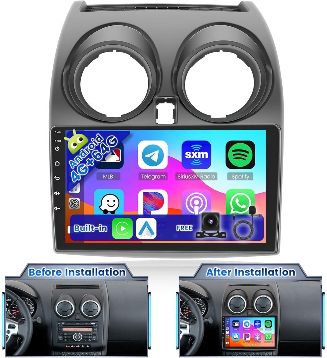 Radio de coche Android para Nissan Qashqai: esta radio Android Carplay es suitable con Nissan Qashqai J10 2006 2007 2008 2009 2010 2011 2012 2013. Viene con accesorios esenciales como adaptador ISO, marco de montaje, cámara de marcha atrás, micrófono externo, cable USB, cable RCA, antena GPS, herramientas de montaje y más.
