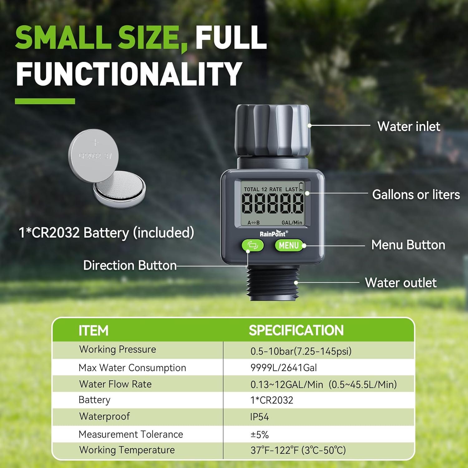 Descripción del producto RAINPOINT práctico Contador de Agua digital giratorio 180° para el jardín