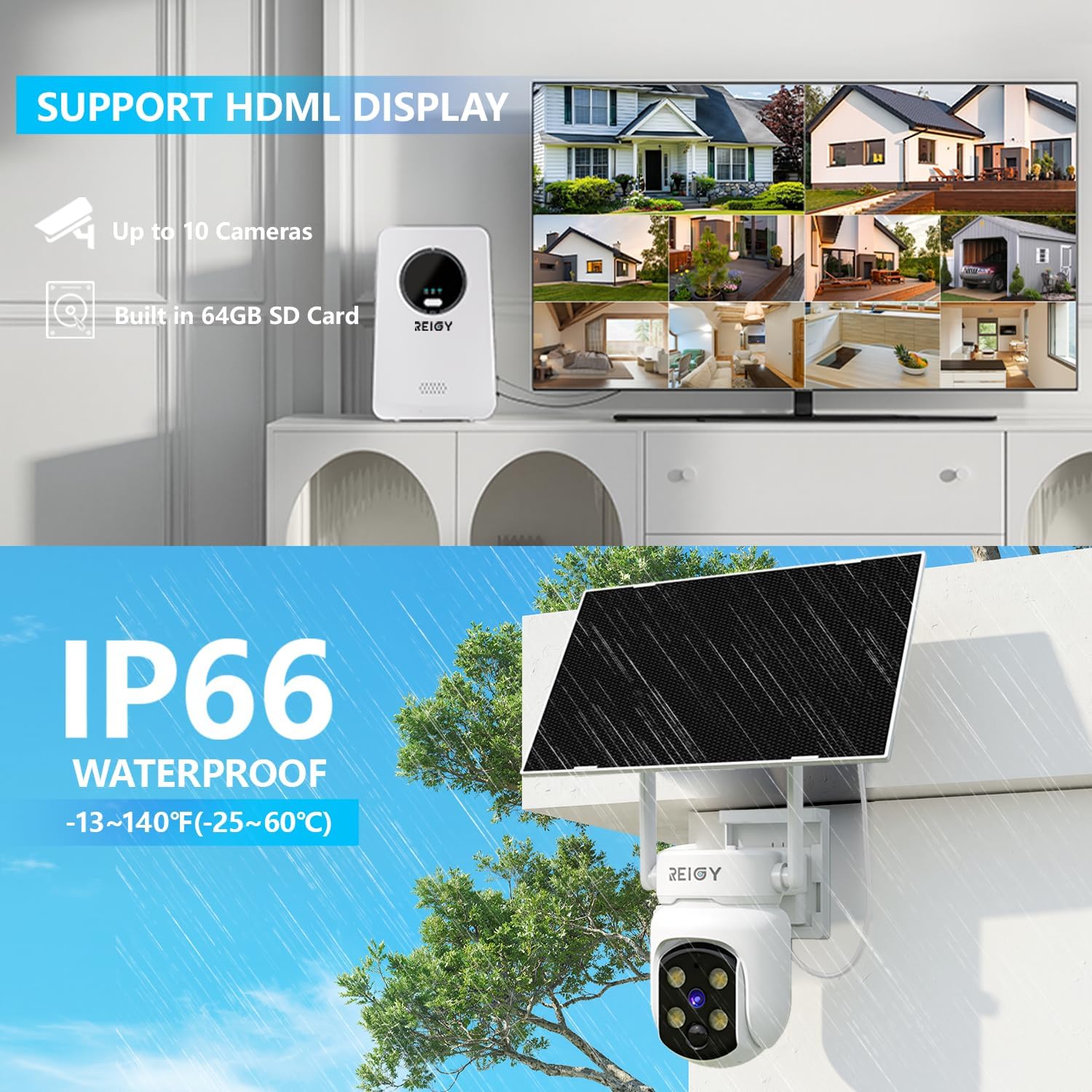 【Sistema de seguridad de 10 canales, agregue más 8 cámaras】 Un sistema puede monitorear toda la casa, una APLICACIÓN satisface todas sus necesidades de vigilancia, el sistema REIGY incluye cámaras interiores, cámaras exteriores, cámaras con batería, cámaras PTZ; Nota: Esta cámara photo voltaic graba el evento cuando se detecta movimiento, si necesita una cámara REIGY con grabación 24/7, elija la cámara con fuente de alimentación.