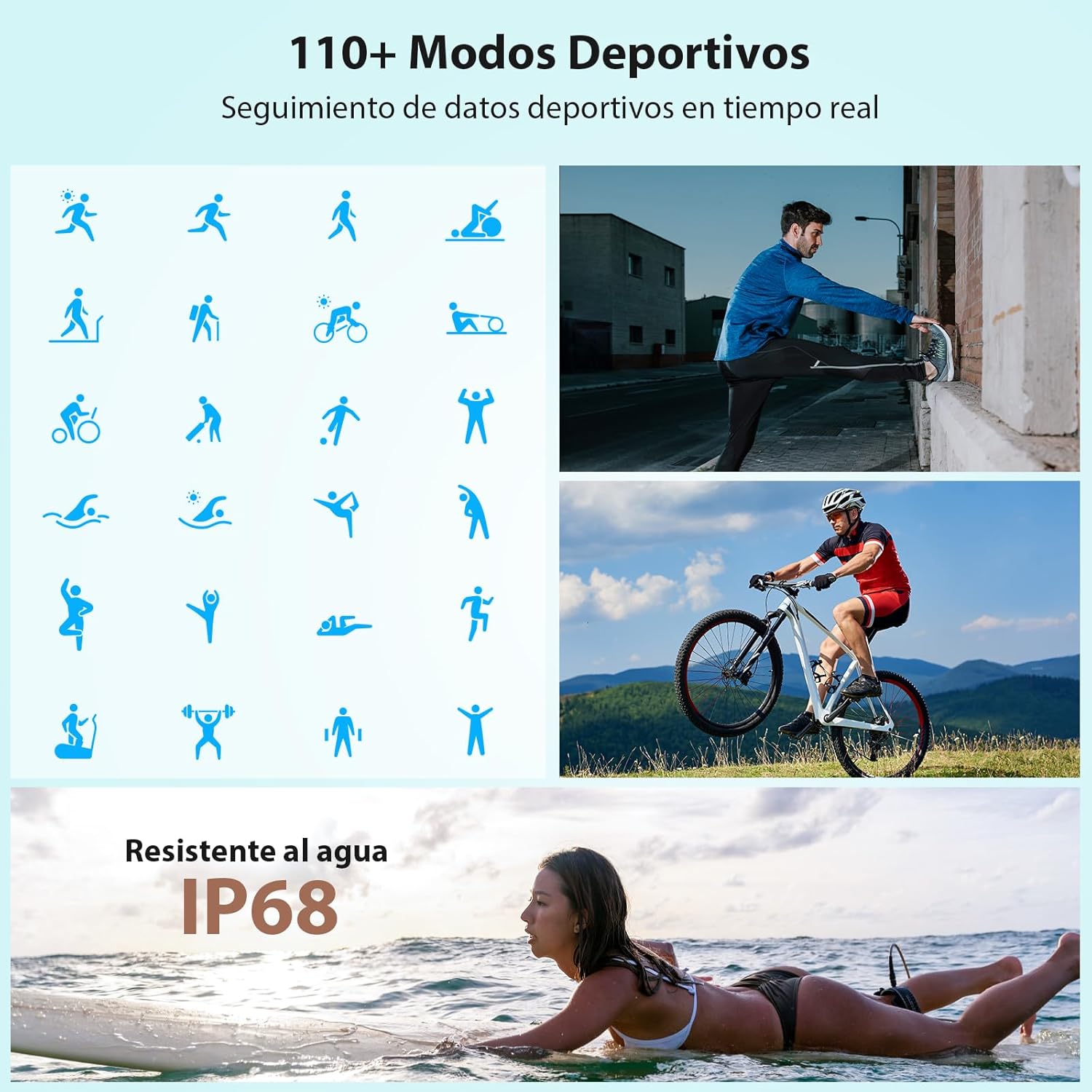 Funciones Prácticas: El reloj inteligente también ofrece funciones prácticas como calculadora, calendario, pronóstico del tiempo, alarma, ciclo menstrual, localizador de teléfono, management de cámara y más. Se adapta a muñecas de 6,5″-9,25″ (165 mm-235 mm).