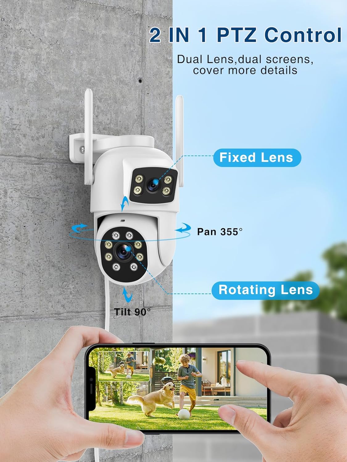 【Doble Lente & Vista de 360 °】 nuestra cámara de vigilancia wifi exterior con dos lentes, una fija y otra giratoria, proporciona un campos de visión de 360 grados. ESTO Permite un seguimiento integral de su zona exterior para garantizar la máxima seguridad. Las dos Pantallas Integlas de Nuestra Cámara Vigilancia Facilitana Exterior AS Usuarios Realizar Un Seguimiento intuitivo Desde Diferentes Ángulos, Aumento -la Eficacia de la Vigilancia.