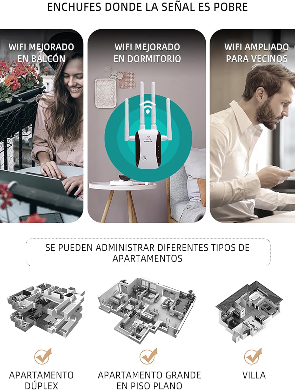 COBERTURA DE SEÑAL SUPER NUEVA: ESTE EXTENSOR DE WIFI SE CONECTA A 4 ANTENAS EXTERNAS Y Utiliza la MÁS RECANTE TECNOLOGÍA DE COBERTURA DE Señal súper potente para superar obstáculos comedes, aseguntar una cobertura sing punta ciegos y proporcionar unsamal másamal máral máral máral máral mál Amplia. Con un Nuevo Chip, Funciona de Manera ráspida sin retrasos, y la Tasa de Transmisión Alcanza Hasta 300Mbps, Permitiéndote Disfrutar de Juegos en Líne