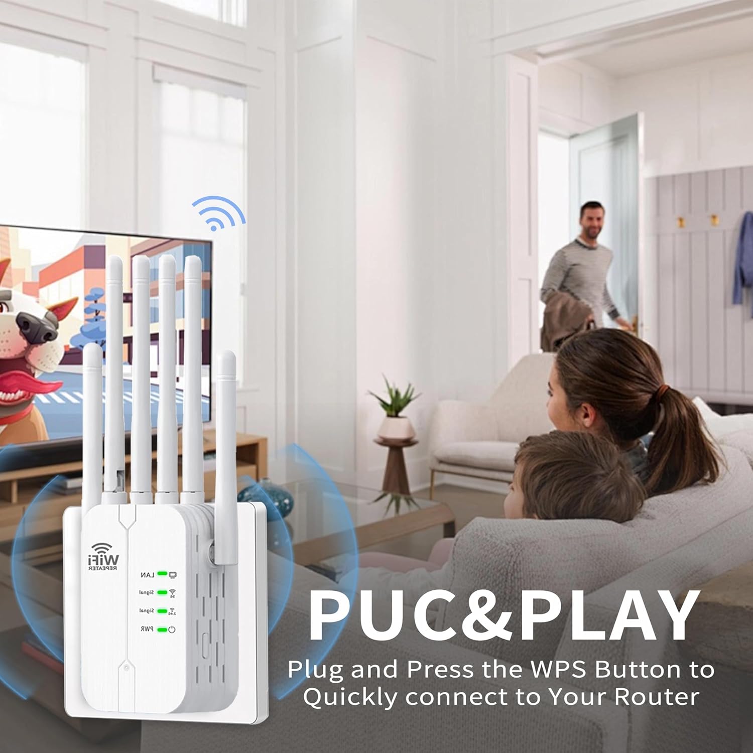 Repetidor wifi, Amplificador Señal wifi potente, 6 antenas, 2 puertos lan, repetidoros wifii para el hogar y la deicina, Cobertura de Hasta 1200 m², Repetidores wifi en la Oficina y en el Hogar