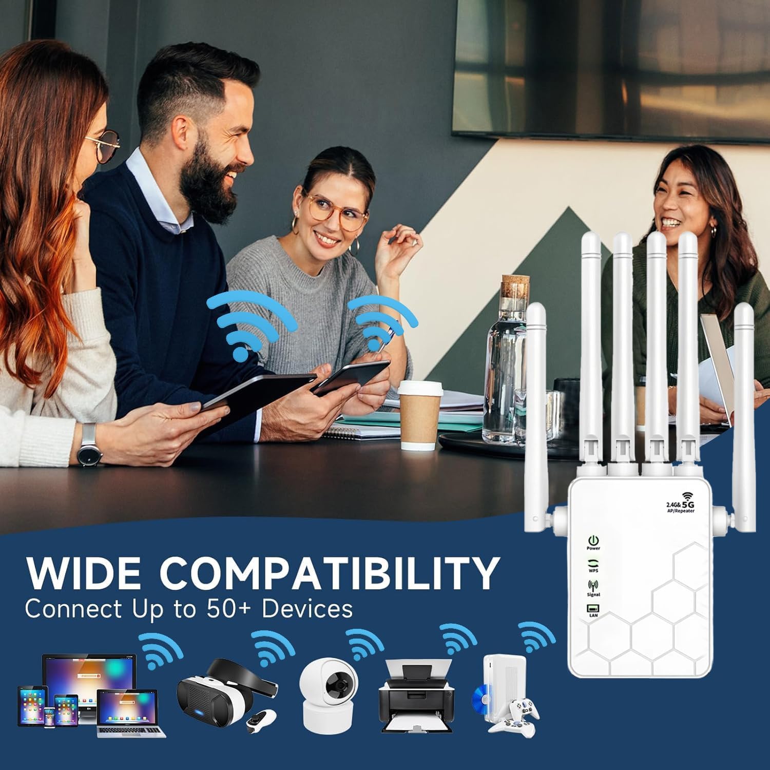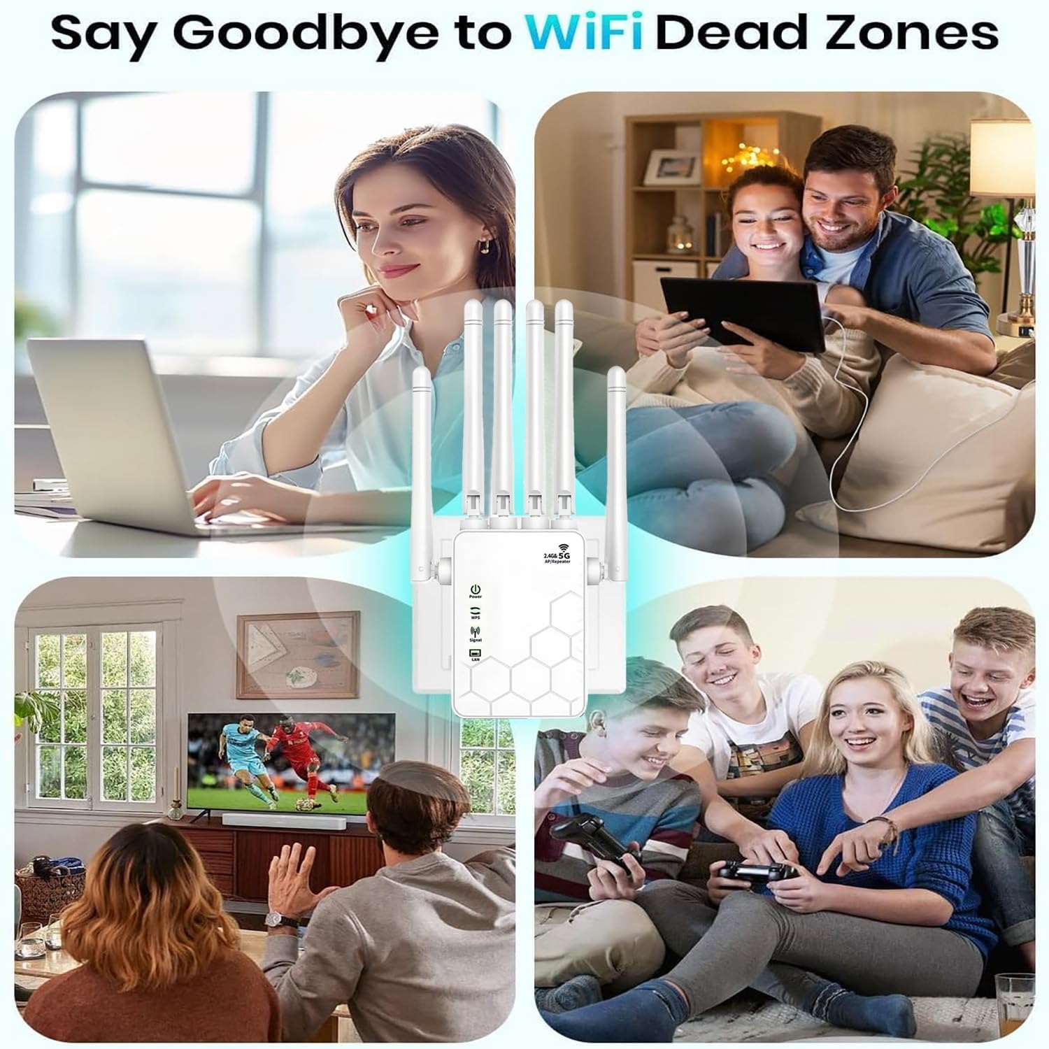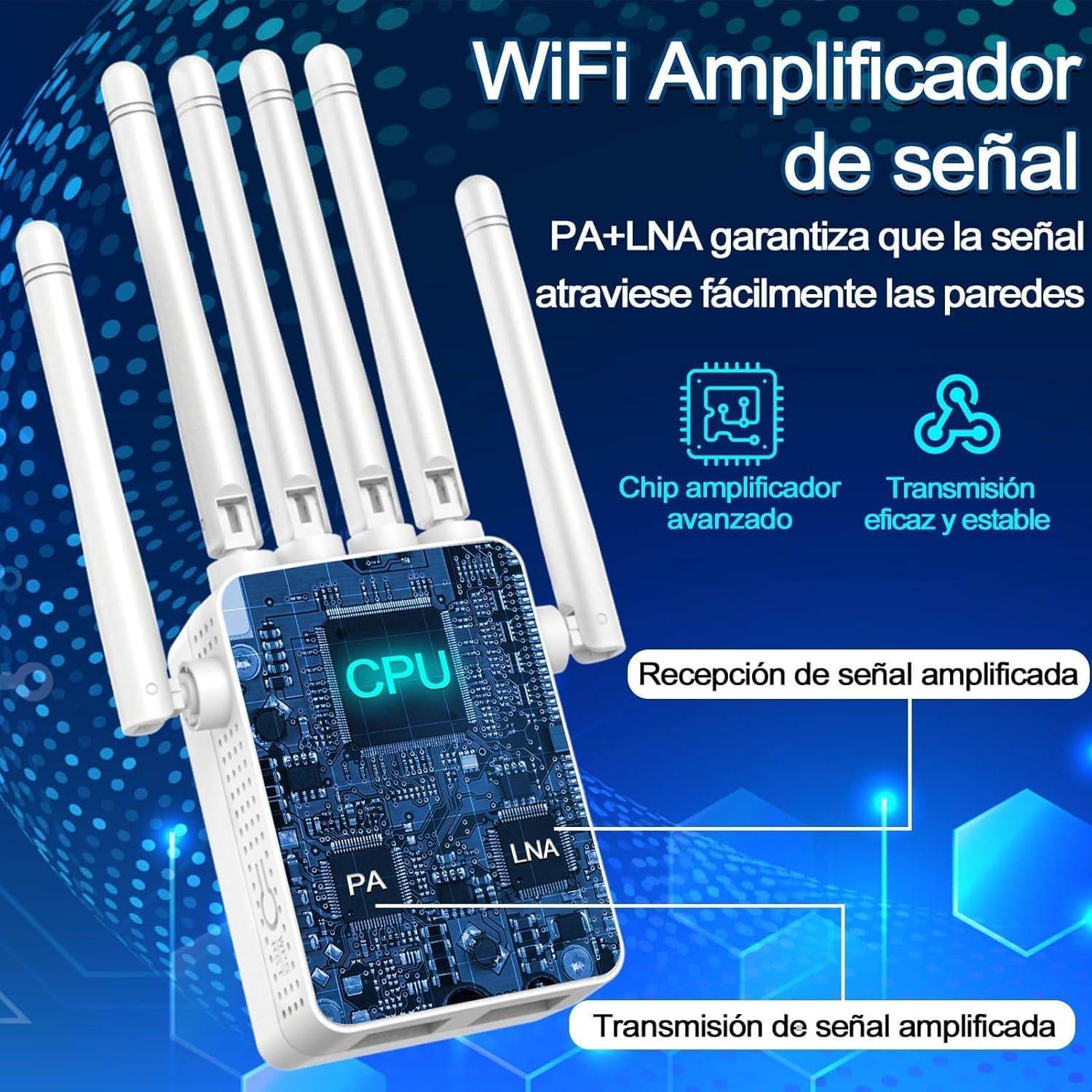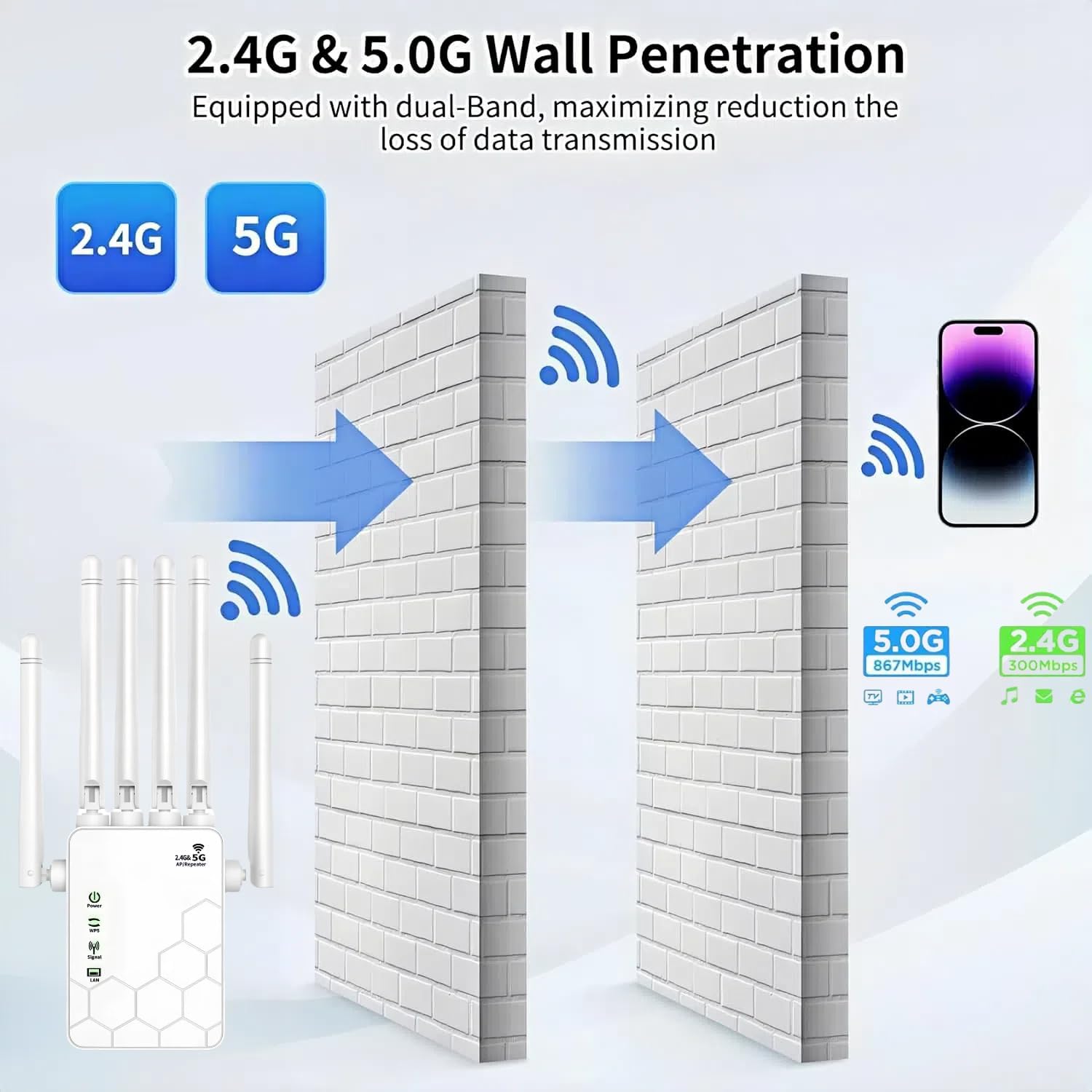 Potente WiFi de alta velocidad: Repetidor WiFi, Extensor WiFi, Amplificador WiFi 1200 Mbps 5 Ghz/2.4 Ghz, 2.4 Ghz a 300 Mbps, 5 Ghz a 867 Mbps, Velocidad complete de Web de unos 1200 Mbps, Doble banda anti-jamming, Equipado con 6 antenas 3dBi de alta ganancia para que disfrutes de vídeos de alta definición, juegos y velocidades de Web de alta gama. Acceso a Web de alta velocidad.