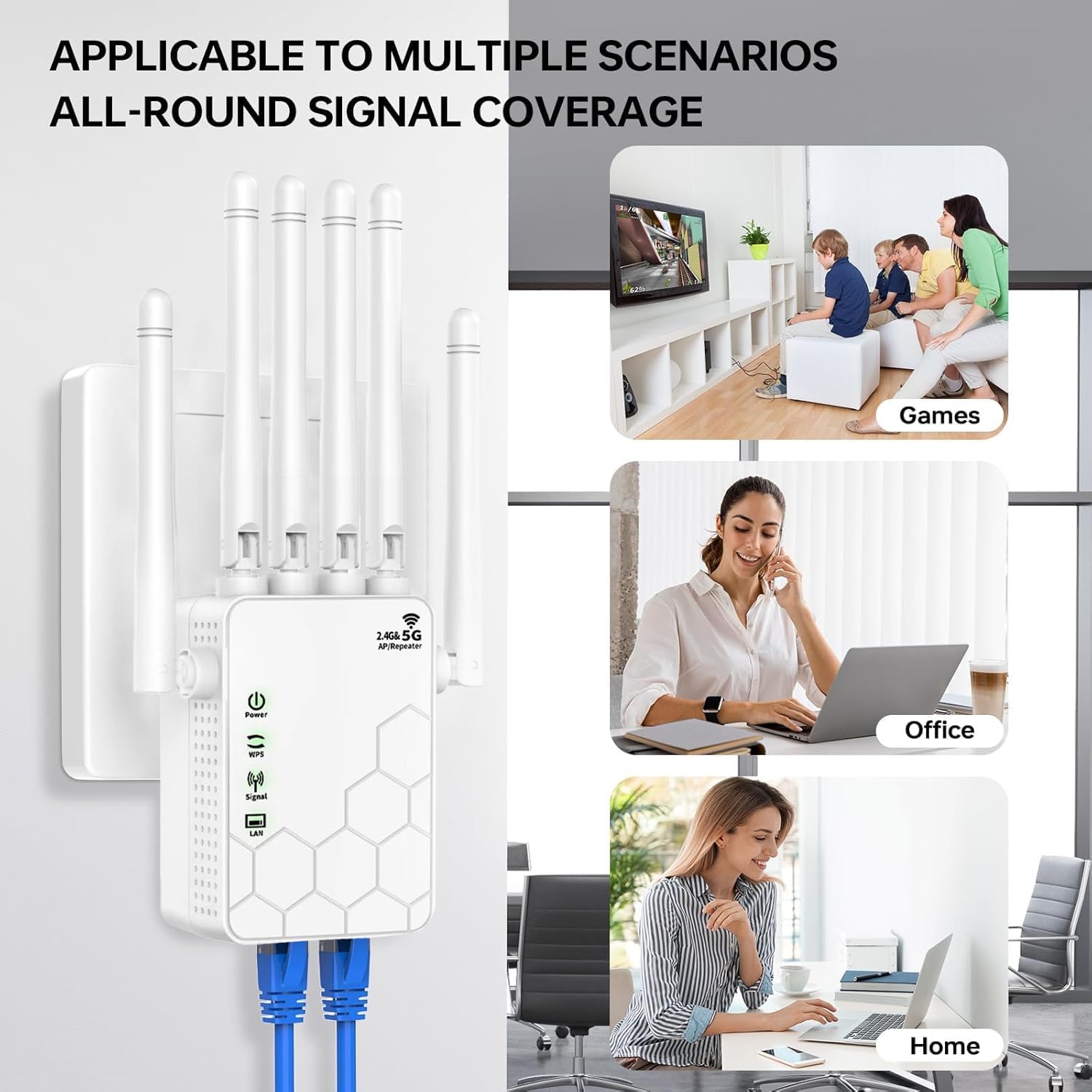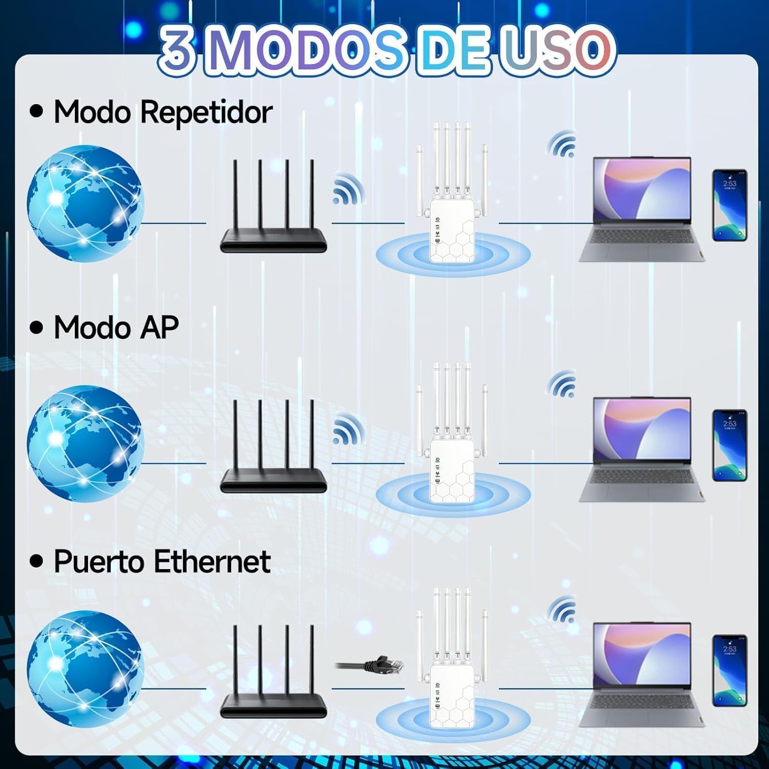 Expansor WiFi multifuncional: Repetidor WiFi El Amplificador de Señal tiene 3 modos: Modo AP/Repetidor/2 puertos Ethernet. El modo repetidor se utiliza para ampliar la cobertura Wi-Fi de una purple inalámbrica existente; el modo AP se utiliza para extender un cable rojo a una purple inalámbrica; 2 puertos Ethernet ayudan a conectar cualquier dispositivo Ethernet cableado. Diseñado para satisfacer sus diferentes escenarios de uso.