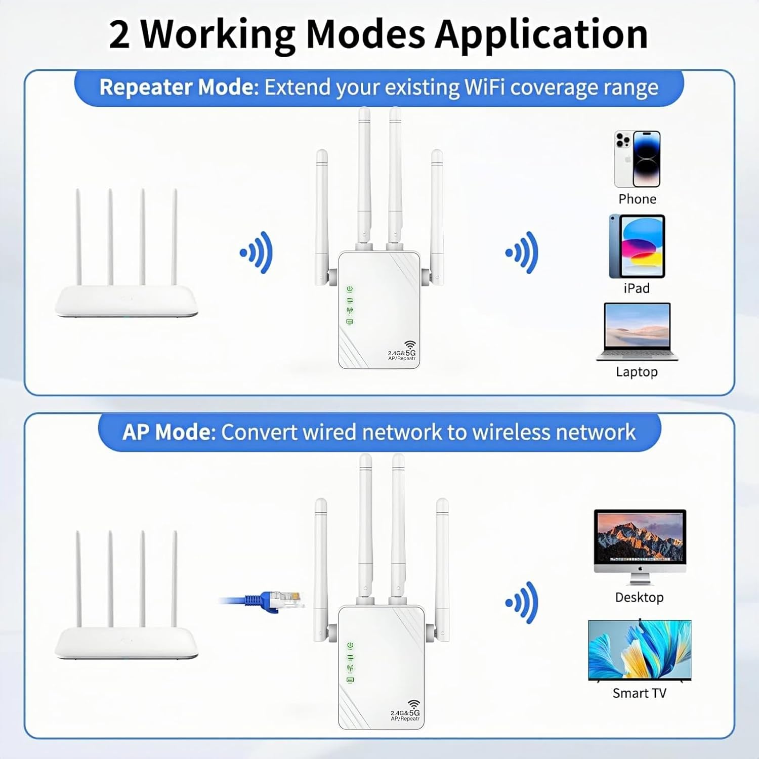 【Extensión WiFi multifuncional】: modo repetidor / modo AP / modo enrutador para satisfacer diferentes necesidades. Con dos puertos Ethernet y cuatro antenas externas, el rendimiento es mejor y la conexión a Web por cable se puede convertir fácilmente en un punto de acceso inalámbrico. Los amplificadores de Web WiFi también se pueden utilizar como adaptadores inalámbricos para conectar dispositivos por cable como reproductores Blu-ray, consolas de juegos o televisores inteligentes.