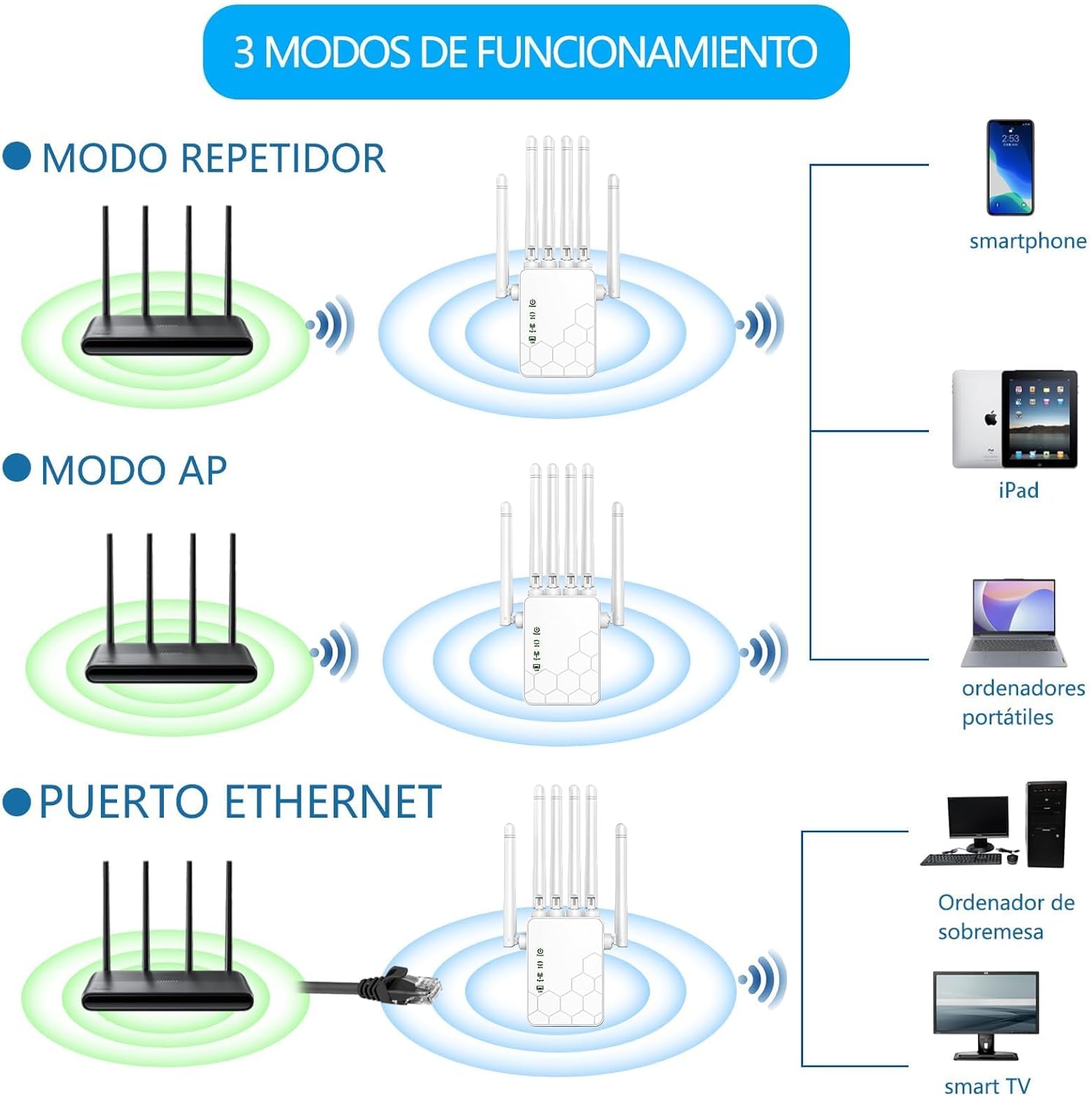 【3 Modos Potentes】El repetidor WiFi de largo alcance admite el modo repetidor / enrutador / AP con dos puertos LAN para satisfacer diferentes necesidades de pink. Puede conectar más de 40 dispositivos inalámbricos simultáneamente, como iPads, portátiles, teléfonos móviles, cámaras internet, impresoras y otros dispositivos, lo que le permite compartir la vida WiFi con familiares y amigos.