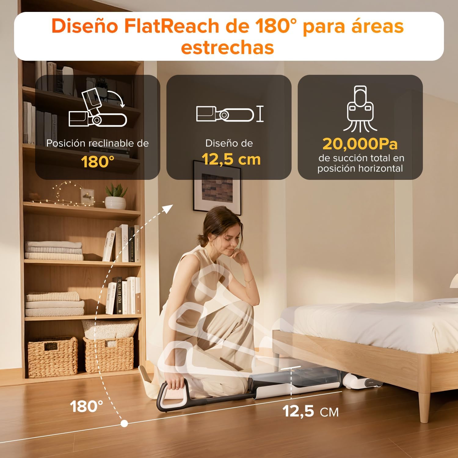 Elegante diseño de limpieza horizontal sin pérdida de energía: transforme su rutina de limpieza con el diseño de limpieza horizontal de 180° que le permite alcanzar fácilmente debajo de los muebles sin afectar la potencia de aspiración. Con una altura de tan solo 12,5 cm, este aspirador es capaz de caber en los espacios más estrechos para que puedas limpiar fácilmente esas zonas de difícil acceso donde le gusta esconder el pelo de tu mascota.