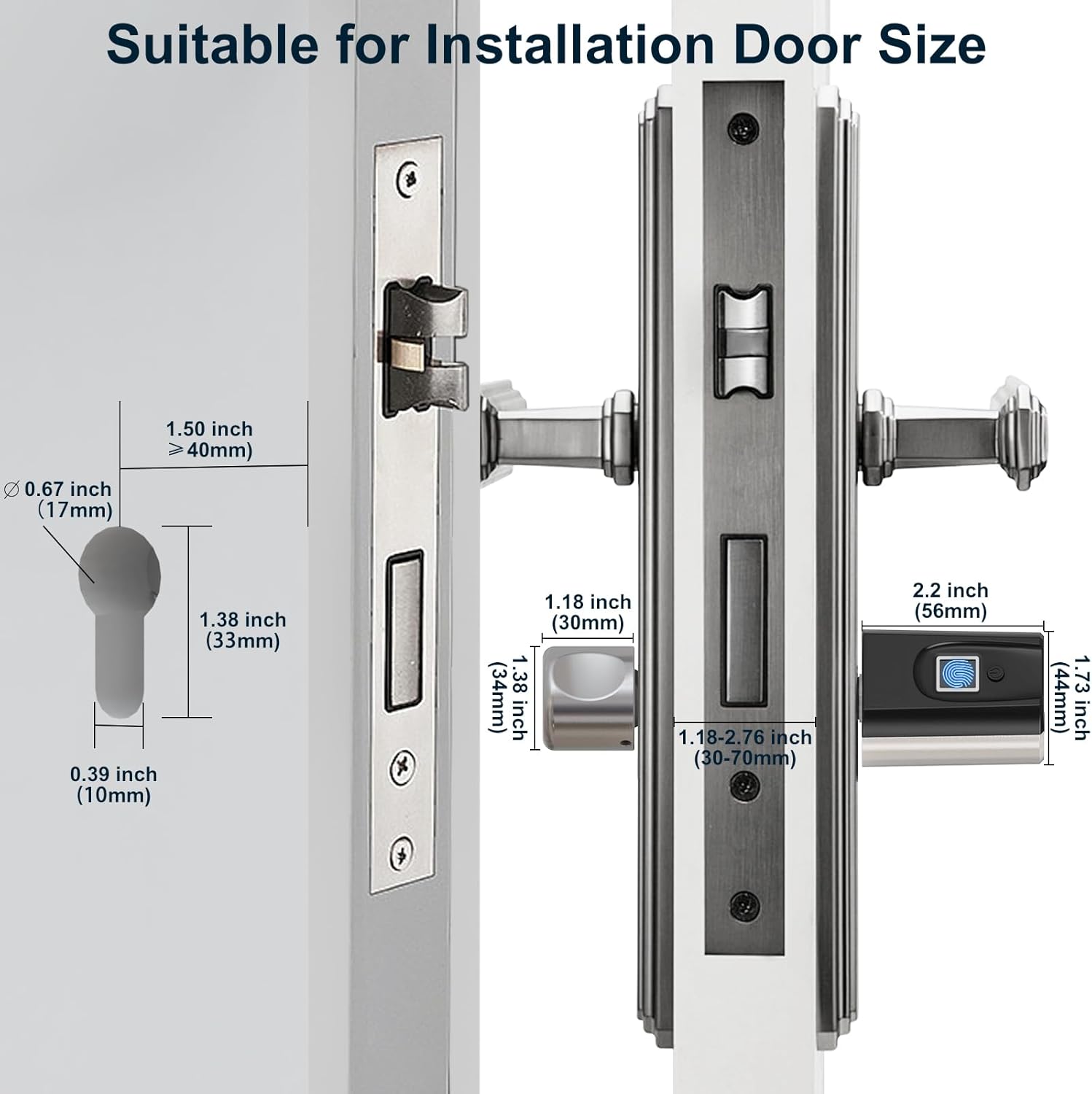 Fácil instalación de bloqueo de huellas dactilares: la cerradura electrónica de la puerta reemplaza el pomo mecánico del cilindro y se puede instalar sin necesidad de taladrar ni tender cables, lo que hace que el reequipamiento sea muy fácil. Los herrajes existentes se mantienen. Adecuado para todas las puertas con un grosor entre 30 mm y 70 mm. Diámetro de los pomos giratorios: exterior 44 mm/inside 34 mm; longitud de la cerradura de la puerta: exterior 56 mm/inside 30 mm. Cilindro de cierre electrónico para puerta: ajustable exterior 27,5 mm – 42,5 mm/inside 27,5 mm – 47,5 mm